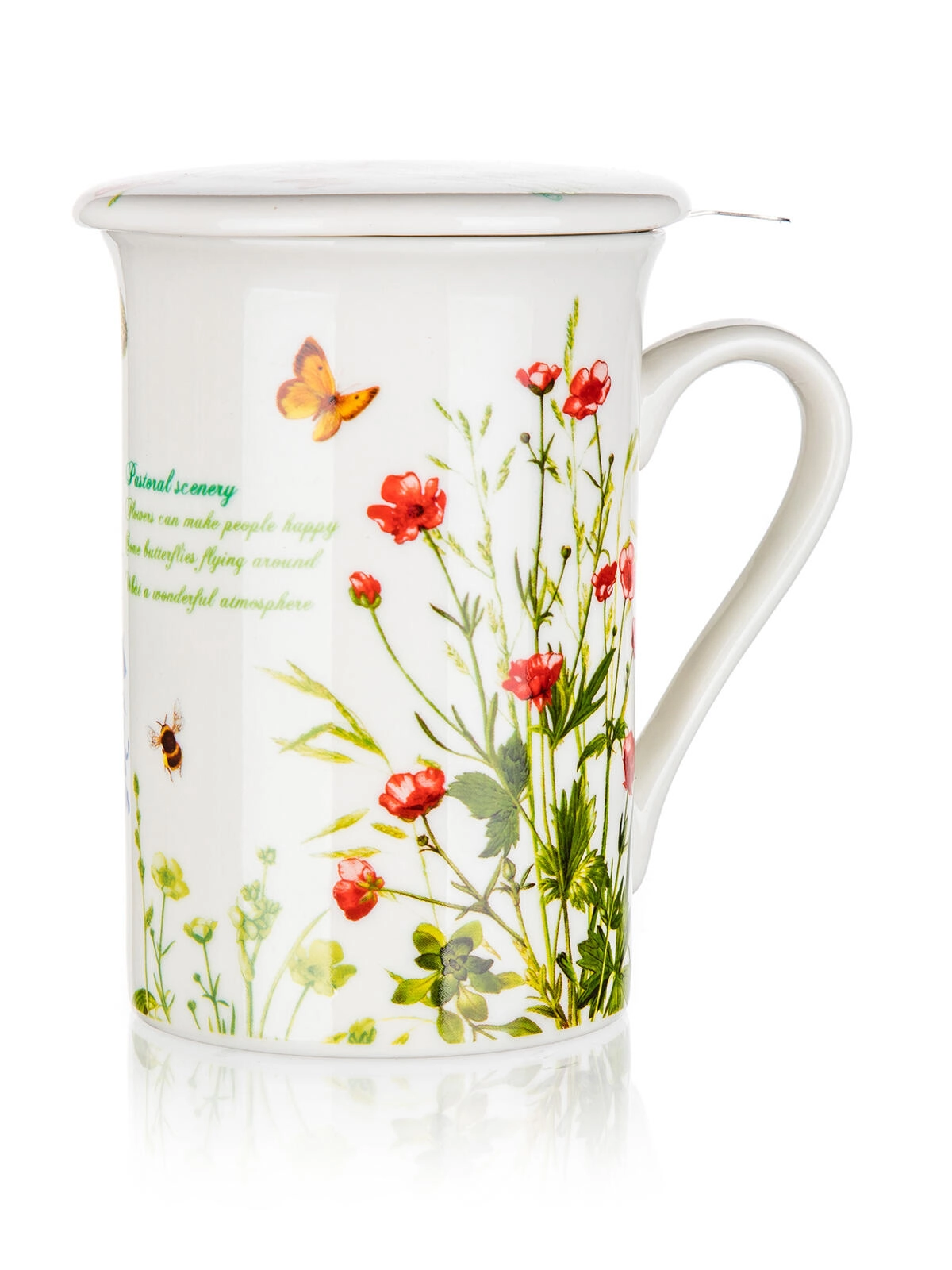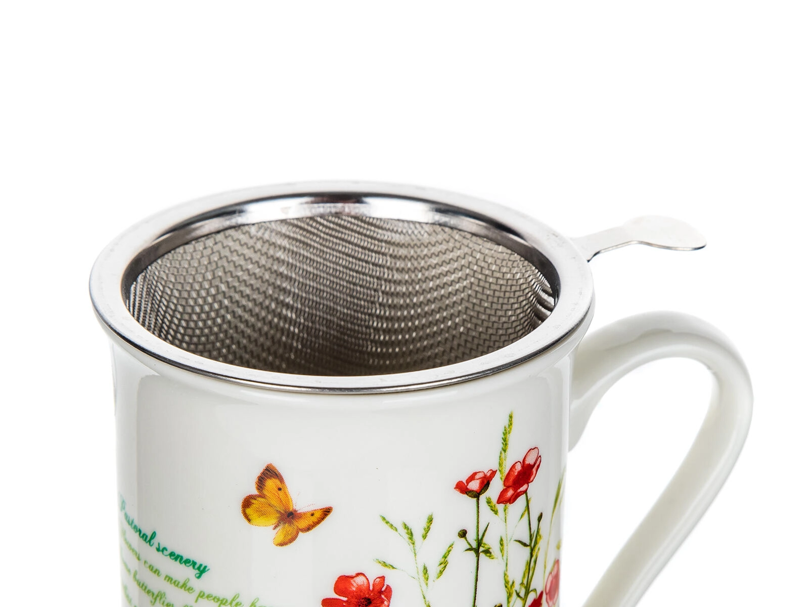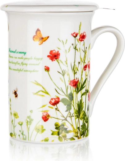 Az ízléses mezei virág minta elegáns kiegészítővé teszi a bögrét otthonra és irodába egyaránt – tökéletes ajándék teakedvelőknek.