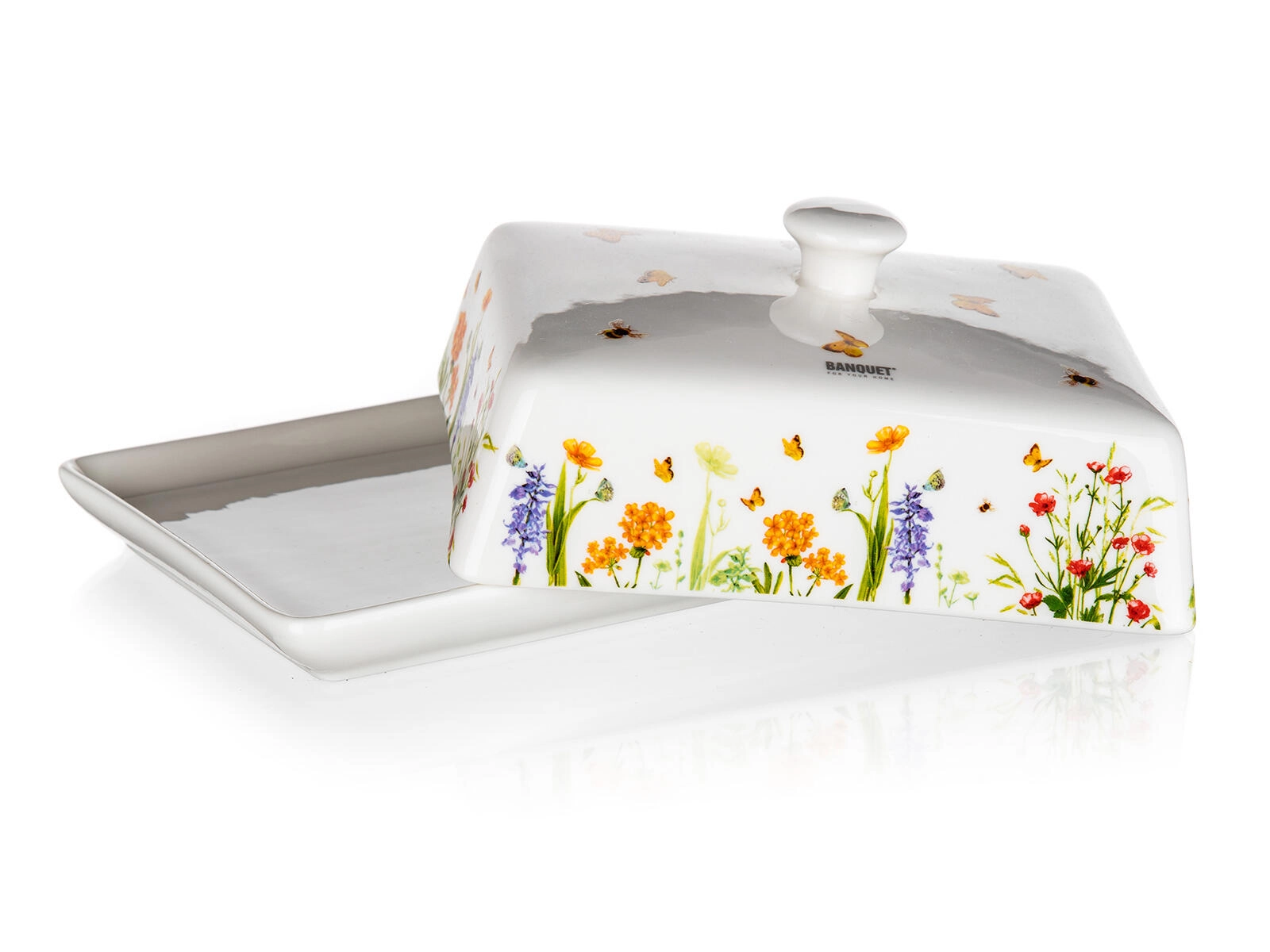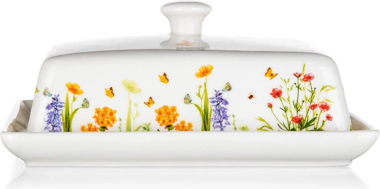 A stílusos Meadow vajtartó ötvözi a funkcionalitást és a dizájnt. A masszív kerámia sima mázzal könnyen tisztítható, a fogós fedél pedig kényelmes emelést és hordozást biztosít. A virágokkal és pillangókkal díszített dekor friss, természetes hangulatot visz a konyhába.