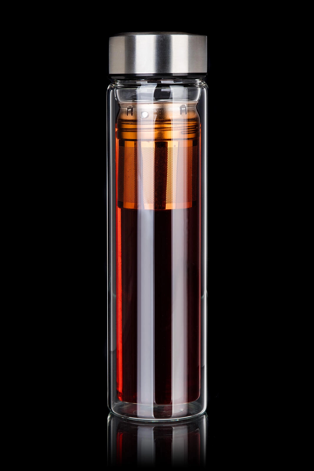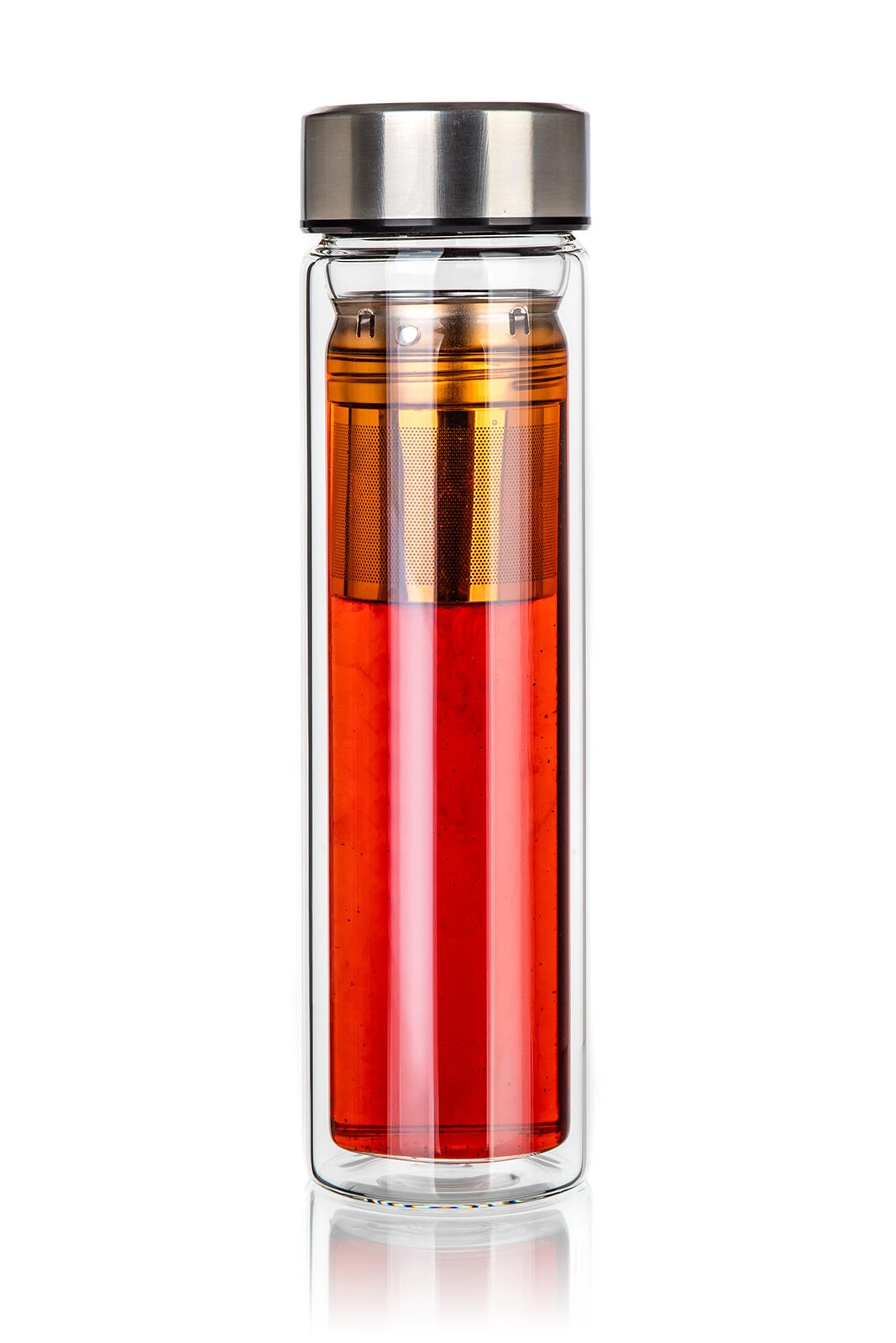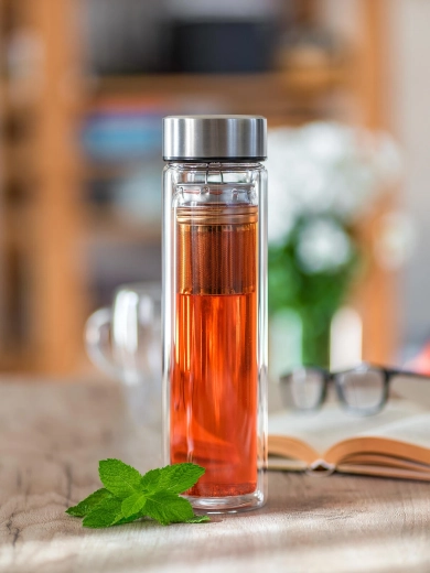 Az integrált rozsdamentes acél szűrő megkönnyíti a szálas tea, a gyógynövények áztatását, illetve a gyümölcsinfúziók elkészítését közvetlenül a palackban.