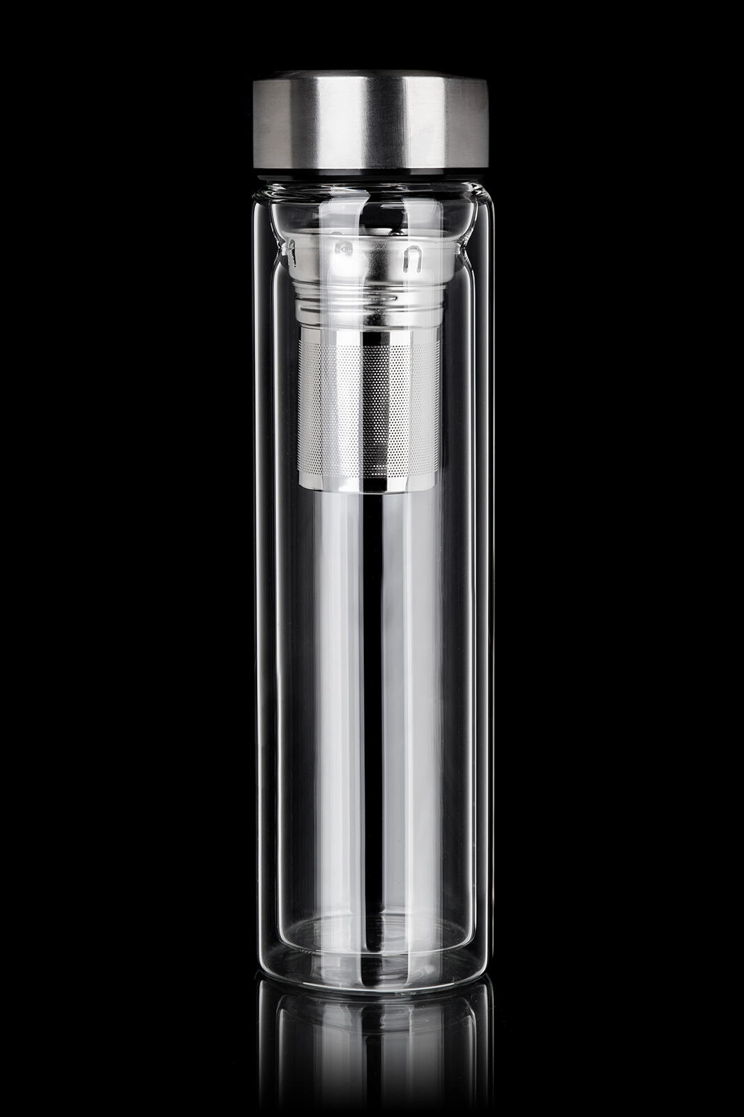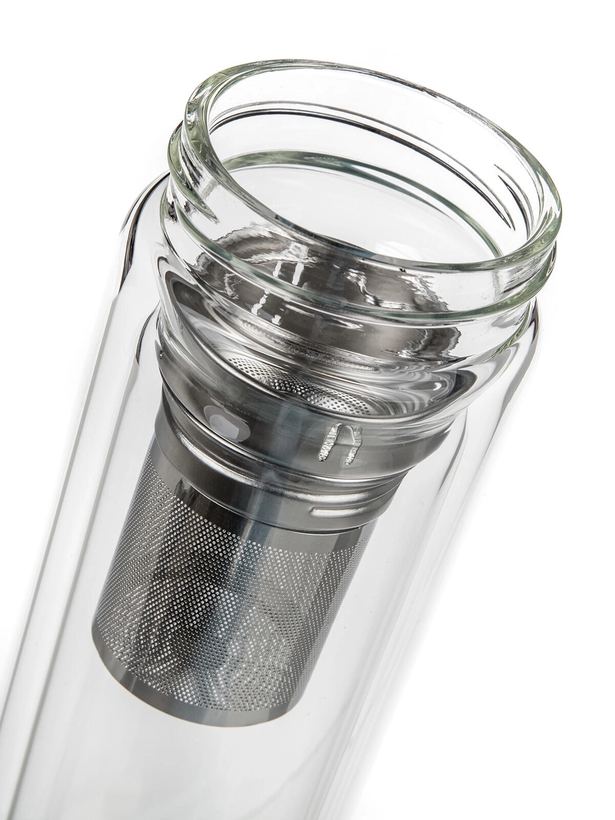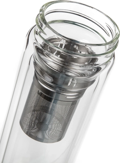 A csomag része a kivehető, finom rozsdamentes acél szűrő, amely lehetővé teszi a szálas tea kényelmes áztatását, illetve a gyógynövényes és gyümölcsös infúziók elkészítését közvetlenül a palackban. A 18/8 rozsdamentes acél kupak higiénikus, tartós és biztonságos zárást garantál. A letisztult, modern, átlátszó üveg dizájn kiemeli az ital színét.