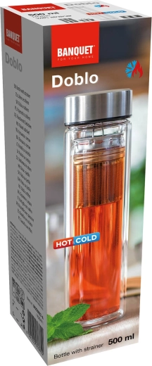 Élvezze kedvenc italát bárhol, bármikor. A DOBLO palack boroszilikát üvegből készül, amely ellenáll a magas hőmérsékletnek és a hősokknak. A duplafalú kialakítás minimalizálja a hőátadást a felületre, így a palack kényelmes fogású, az ital pedig tovább megőrzi ideális hőmérsékletét – legyen szó forró teáról vagy frissítő, gyümölcsös vízről.