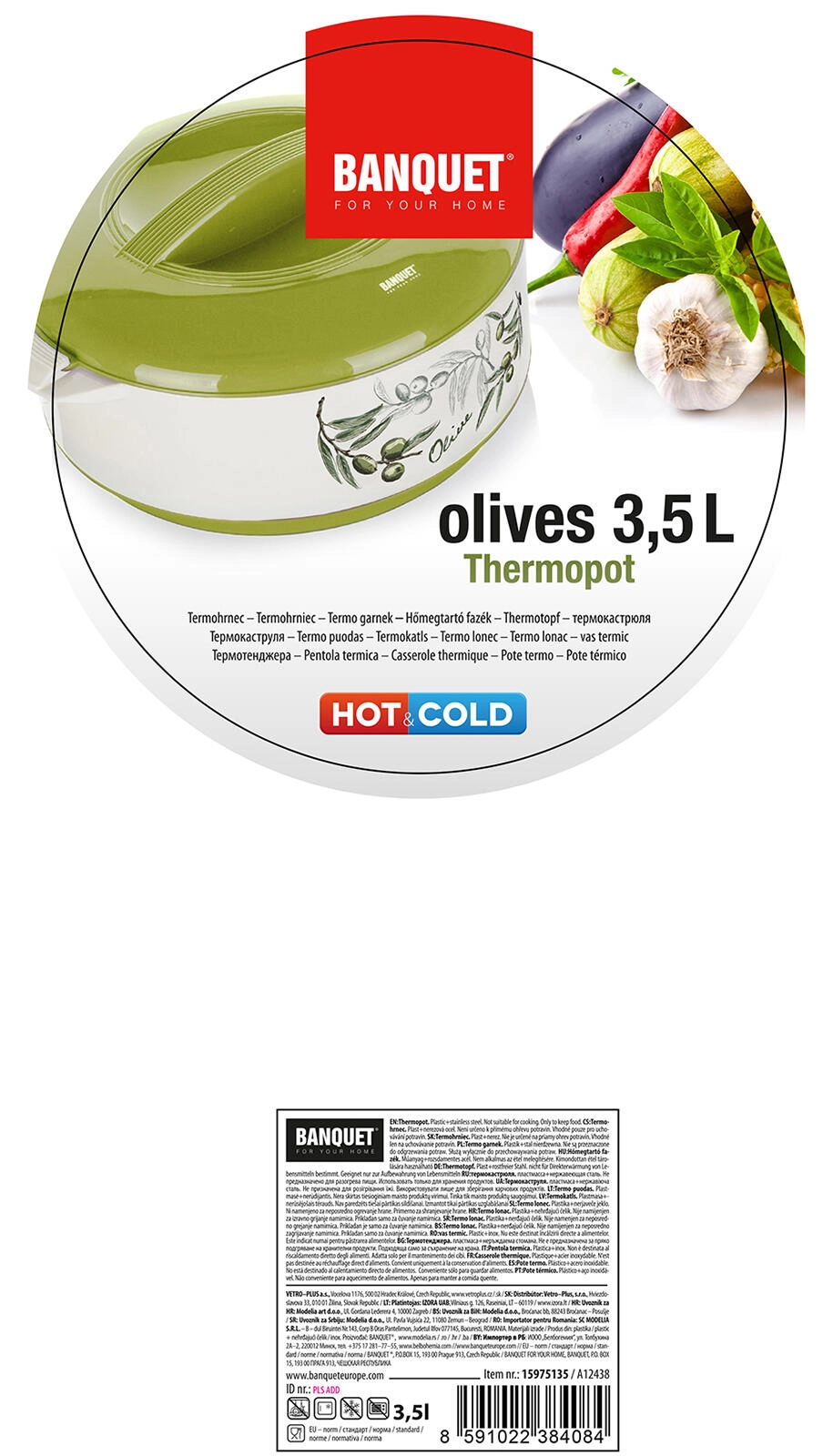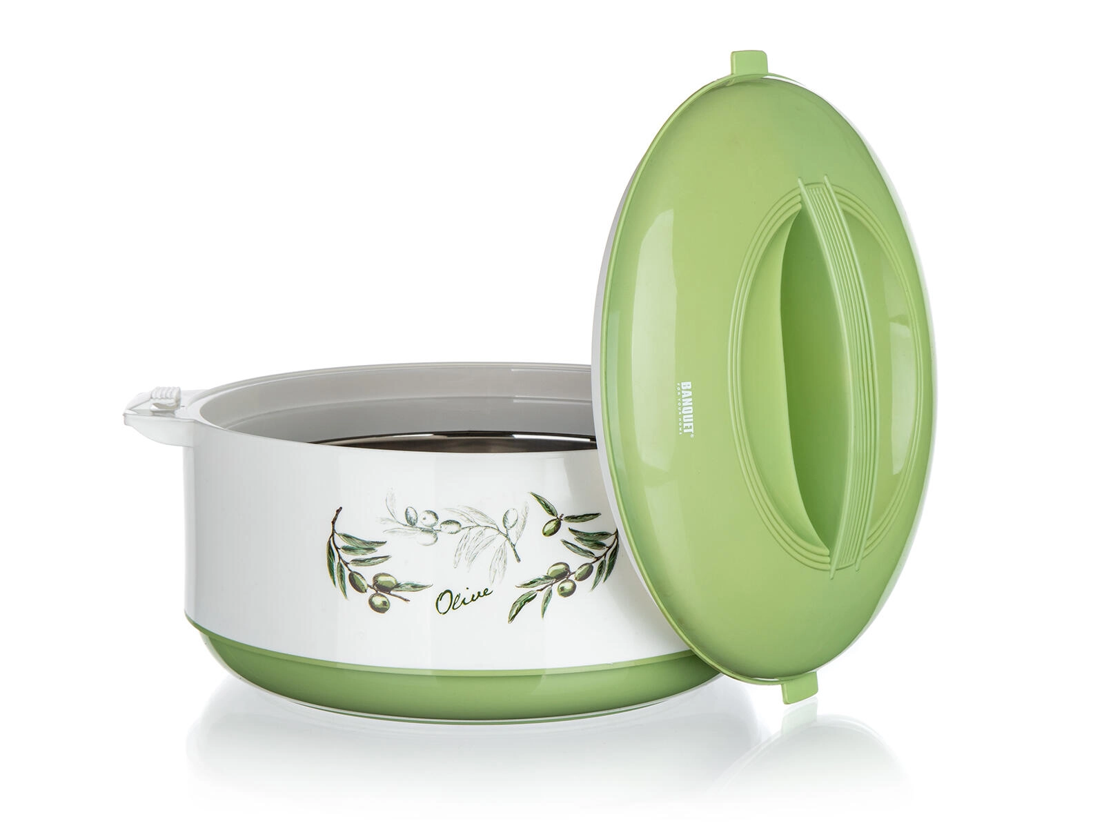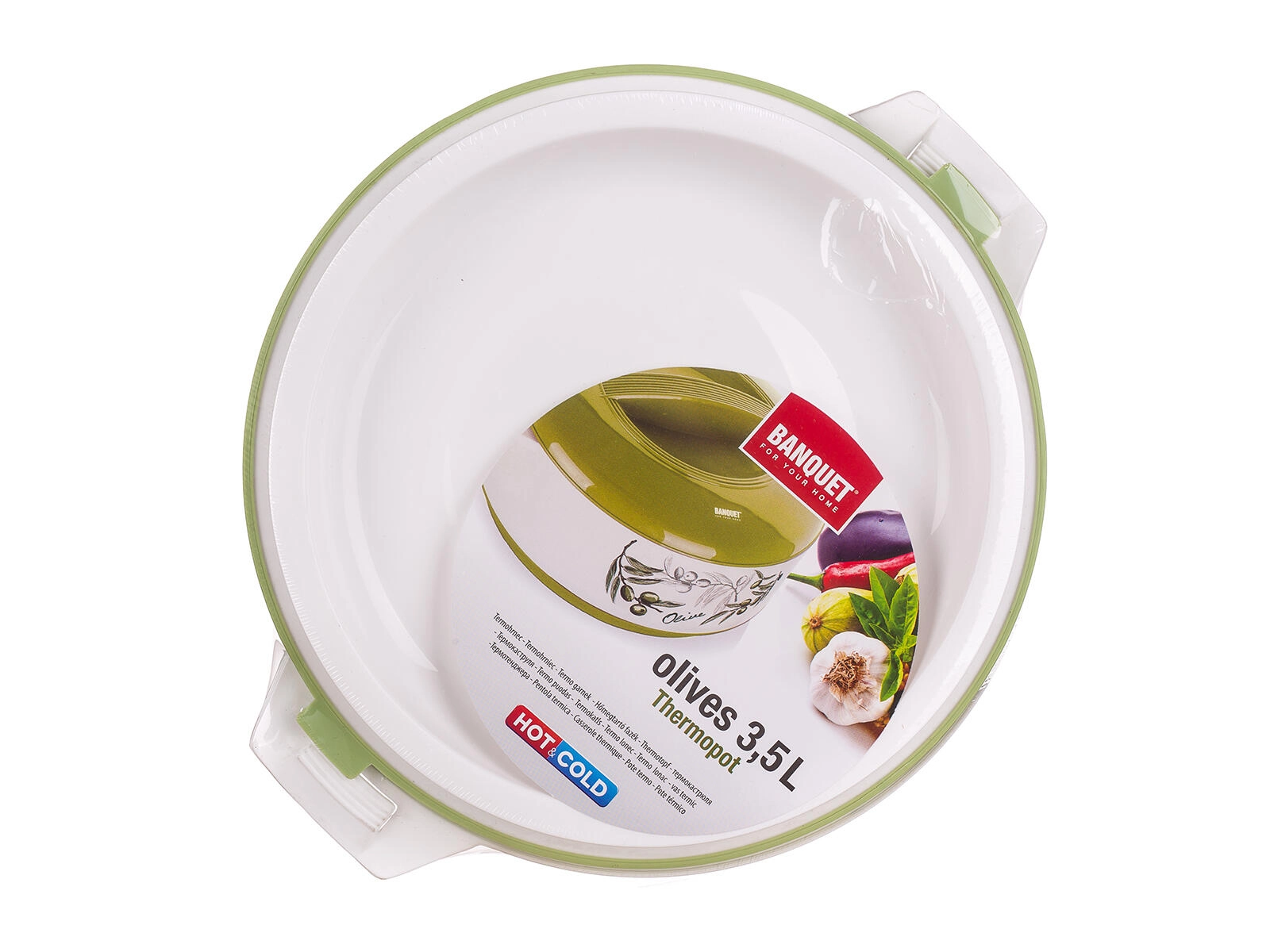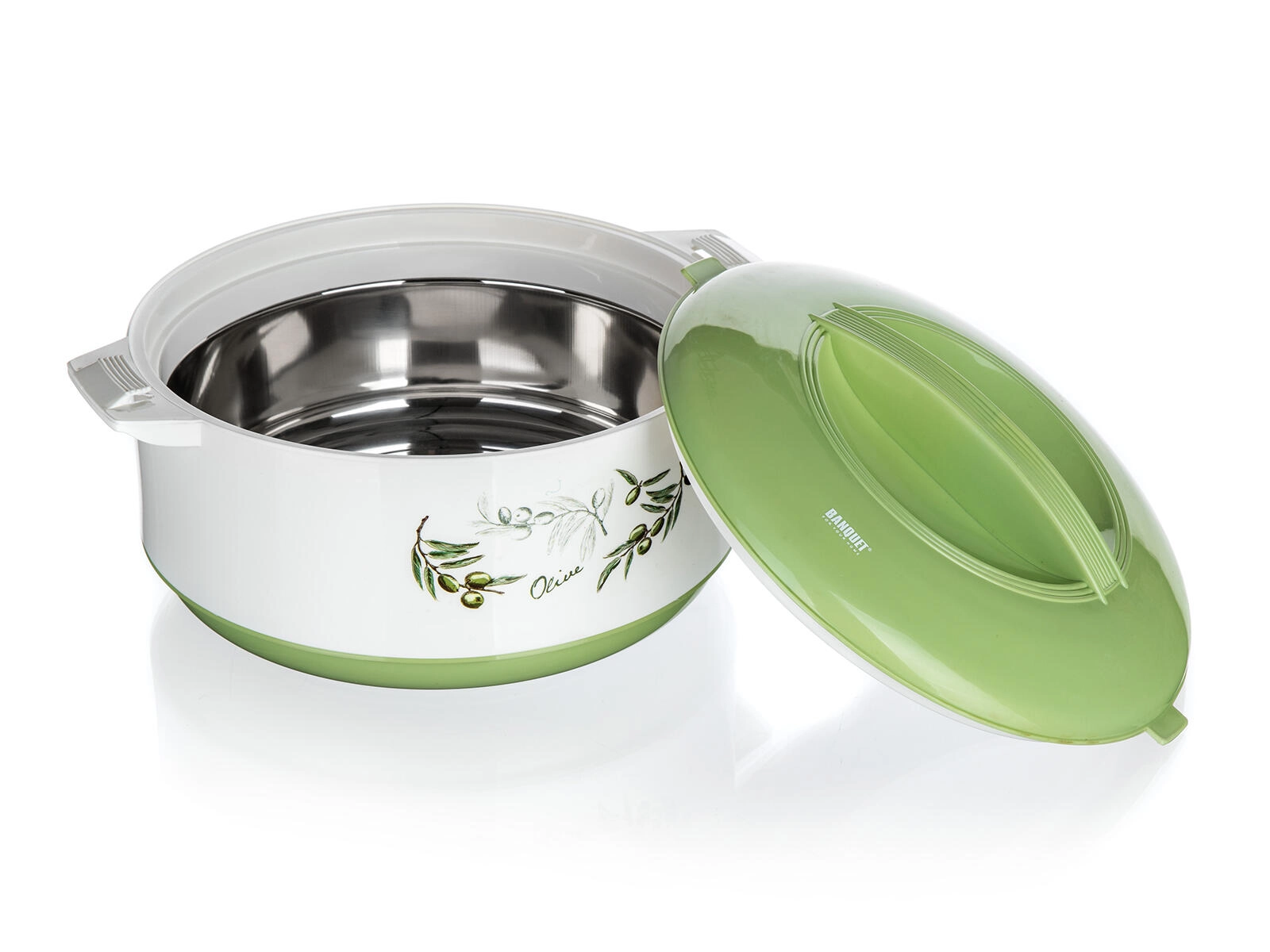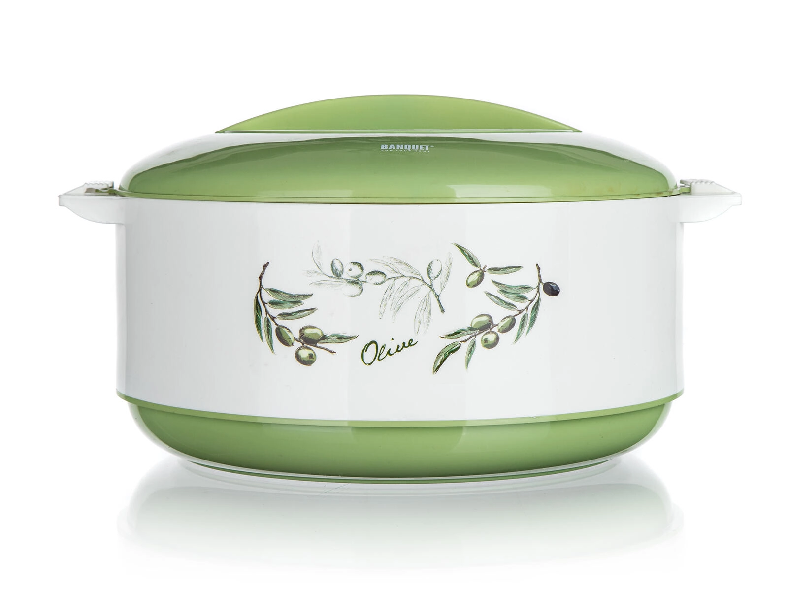 A stílusos OLIVES termos tál 3,5 l űrtartalommal nélkülözhetetlen segítőtárs a mindennapi és ünnepi étkezéseknél. A dupla kialakítás rozsdamentes belső tállal és PUR szigeteléssel a kívánt hőmérsékleten tartja az ételeket az íz és szaftosság elvesztése nélkül. Az elegáns olívadíszítés minden konyhába és asztalra illik.