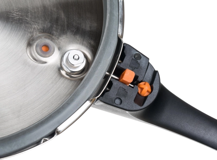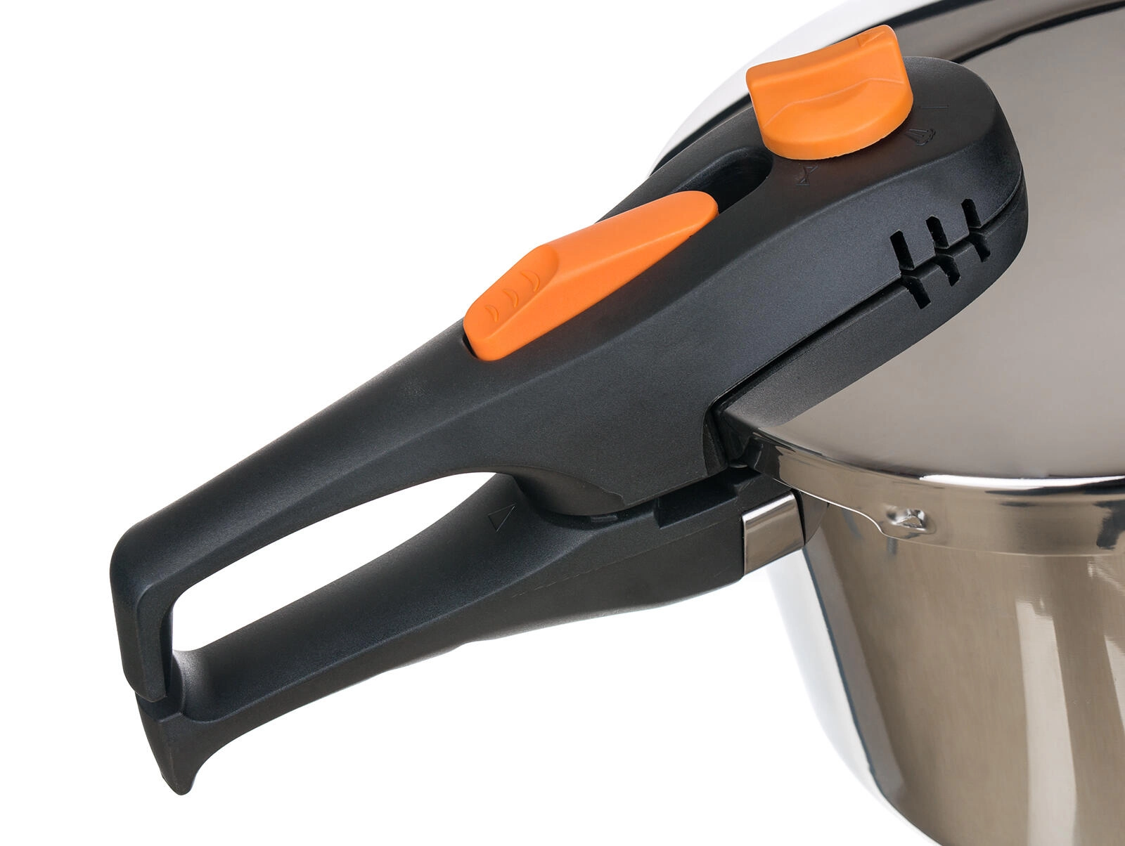 A fedél munkaszeleppel, nyitásgátló biztosítékkal és ergonomikus narancssárga vezérlővel biztos zárást és kényelmes gőzleeresztést tesz lehetővé.