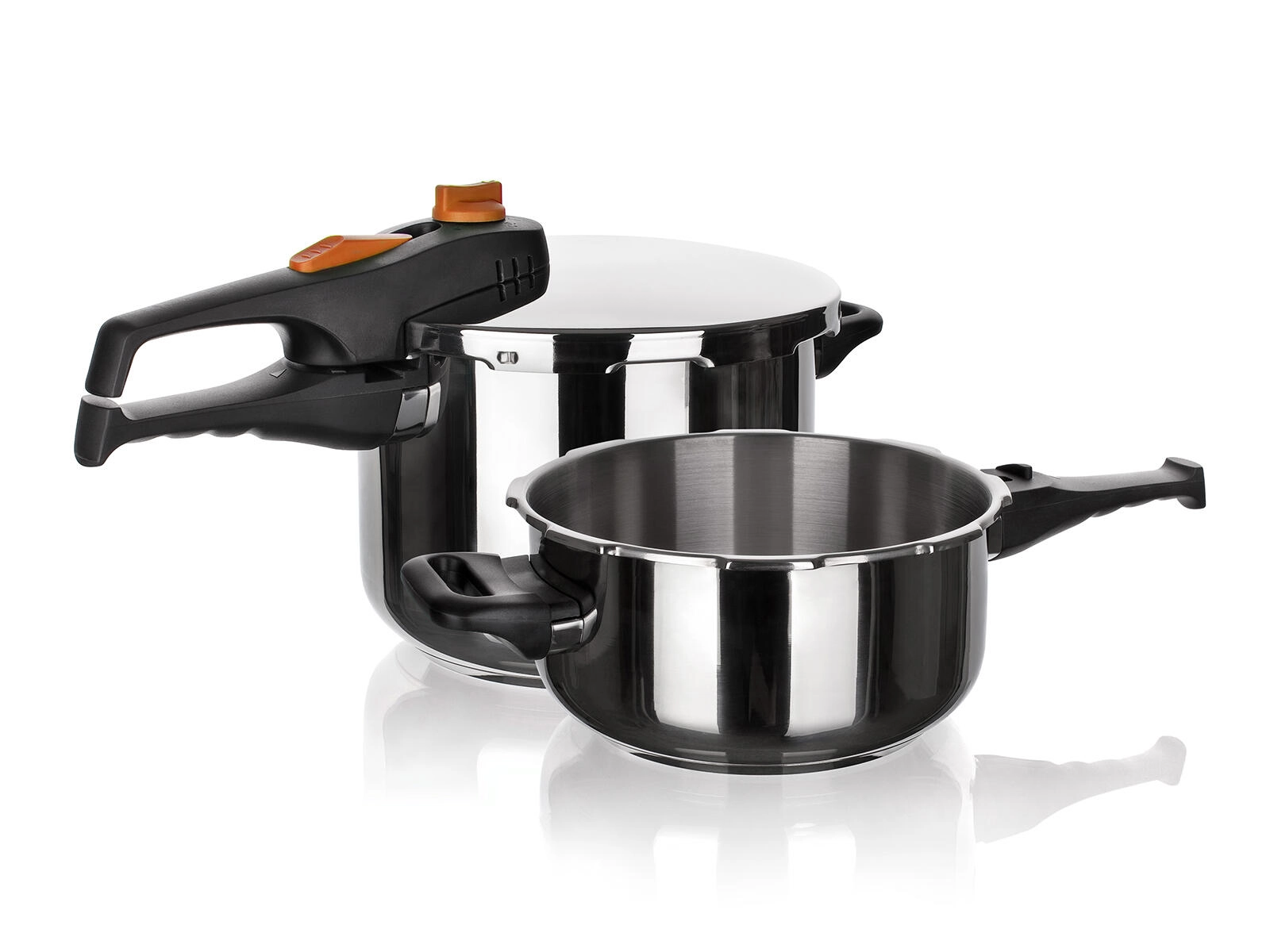 Az ADAGIO kuktaszett az ellenálló 18/8 rozsdamentes acélt, az átgondolt biztonsági elemeket és a kényelmes, narancssárga gombos vezérlést ötvözi. A két univerzális, 4 l és 6 l-es űrtartalom ideális gyors levesekhez, alaplevekhez, hüvelyesekhez, valamint kíméletes hús- és zöldségkészítéshez. A masszív, 5 mm-es szendvics alj stabilitást és kiváló hőátadást nyújt gázon, üvegkerámián, elektromos főzőlapon és indukción.