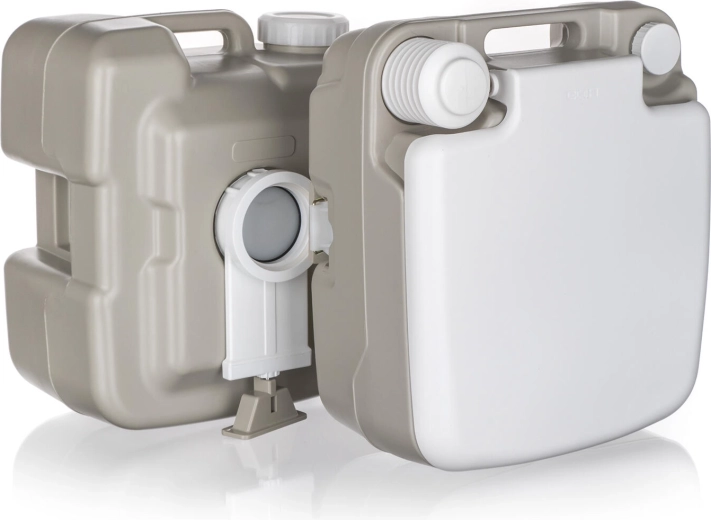 A 20 l-es szennyvíztartály és a különálló 14 l-es tisztavíz-tartály elegendő kapacitást nyújt többnapos használathoz. A strapabíró HDPE anyagot hosszú élettartamra tervezték nehéz körülmények között is, míg az új, megerősített fenékkialakítás csökkenti a sérülés kockázatát gyakori hordozásnál. A csomag tartalmaz egy tölcsért a vegyszeres adalékok kényelmes utántöltéséhez.