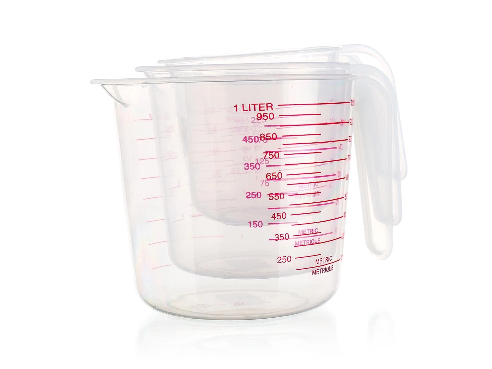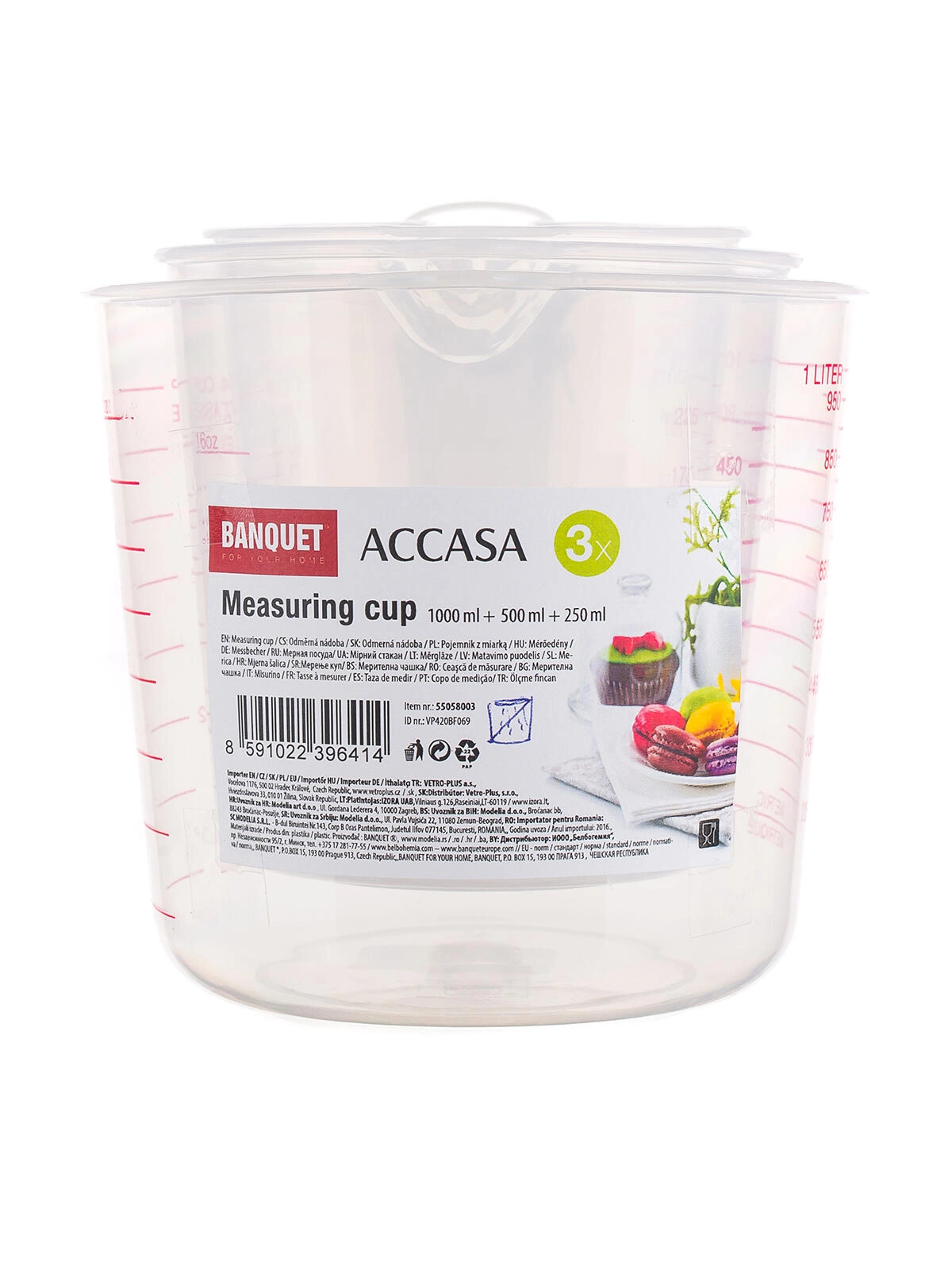 Az ACCASA mérőedény-készlet pontos mérést biztosít folyadékokhoz és szilárd alapanyagokhoz a konyhában. A három praktikus űrtartalom – 0,25 l, 0,5 l és 1 l – lefedi a mindennapi főzést és sütést. Az átlátszó műanyag piros, jól olvasható jelölésekkel milliliterben és unciában megkönnyíti a mennyiségek ellenőrzését minden szögből.