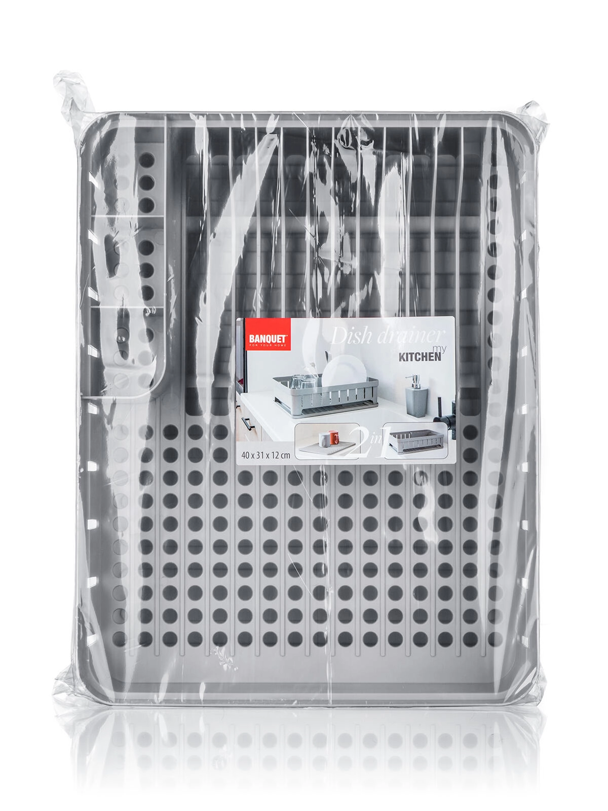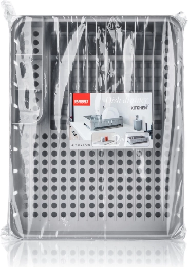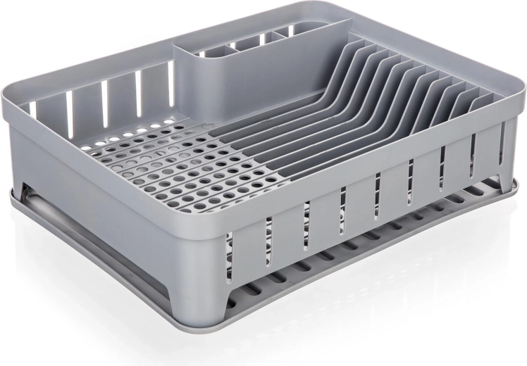 Praktikus edényszárító tálcával szürke színben, 40 × 31 × 12 cm méretben, így elegendő helyet biztosít a mindennapi mosogatáshoz. Elkülönített rekeszekkel a evőeszközöknek, tányéroknak és egyéb edényeknek, amelyeknek köszönhetően az edények szárítása átlátható és gyors. A strapabíró műanyag könnyen tisztítható, a tálca pedig felfogja a lecsöpögő vizet, hogy a konyhapult tiszta és száraz maradjon.