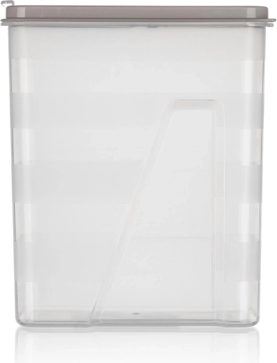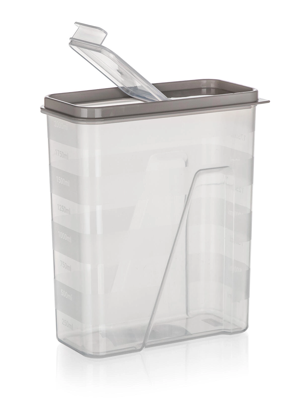 Praktikus, 2 literes konyhai tároló doboz az ömlesztett alapanyagok átlátható tárolásához. Átlátszó test 250 ml-enkénti mérőskálával a könnyű adagoláshoz, tömítő, felnyitható tető latte színben az alapanyagok frissen tartásáért és a kényelmes szórásért szétszóródás nélkül.
