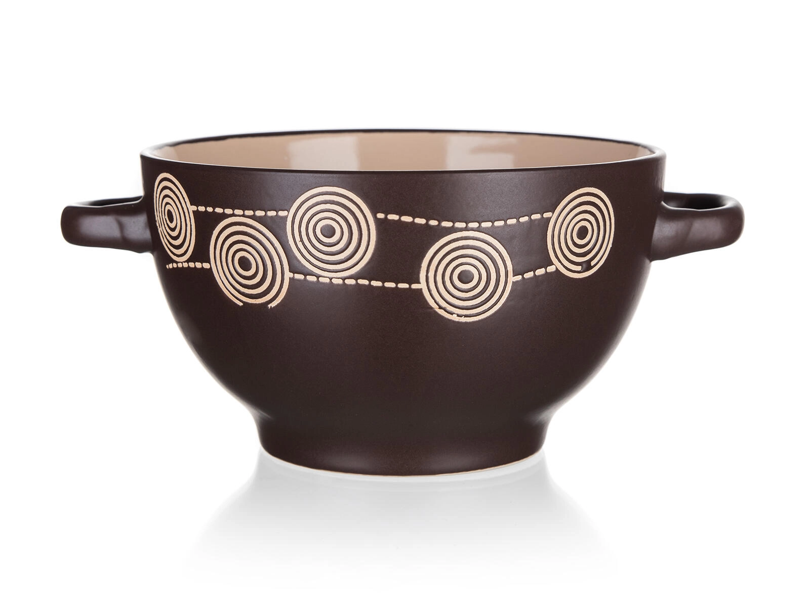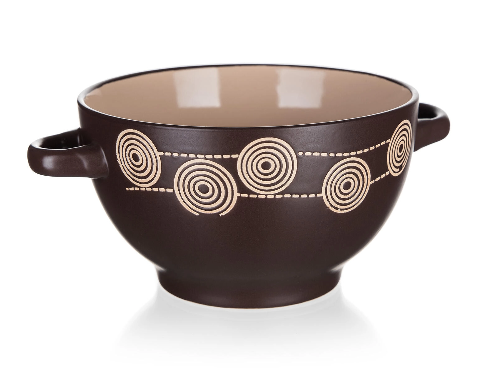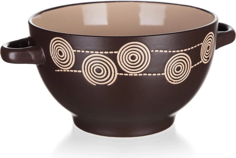 Stílusos, füles kerámia tál Spirál dekorral, sötétbarna színben – ideális levesek, müzli vagy tészta tálalásához. Űrtartalma 660 ml, tartós és könnyen tisztán tartható – mikrohullámú sütőben használható és mosogatógépben mosható. A praktikus 13,5 cm-es átmérő és a kényelmes fülek megkönnyítik a hordozást és a mindennapi használatot.