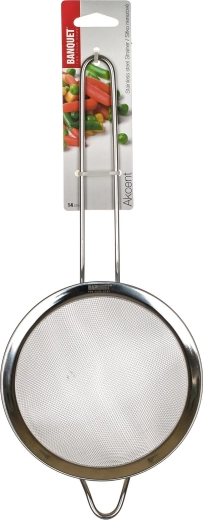A praktikus AKCENT konyhai szűrő 14 cm átmérővel ideális folyadékok szűrésére, alapanyagok átöblítésére és finom filtrálásra. Strapabíró rozsdamentes kivitel, kényelmes fém nyél akasztófüllel és finom, 0,28 mm-es háló 20 szem/cm² sűrűséggel a tiszta és gyors eredményért a mindennapi főzés során.