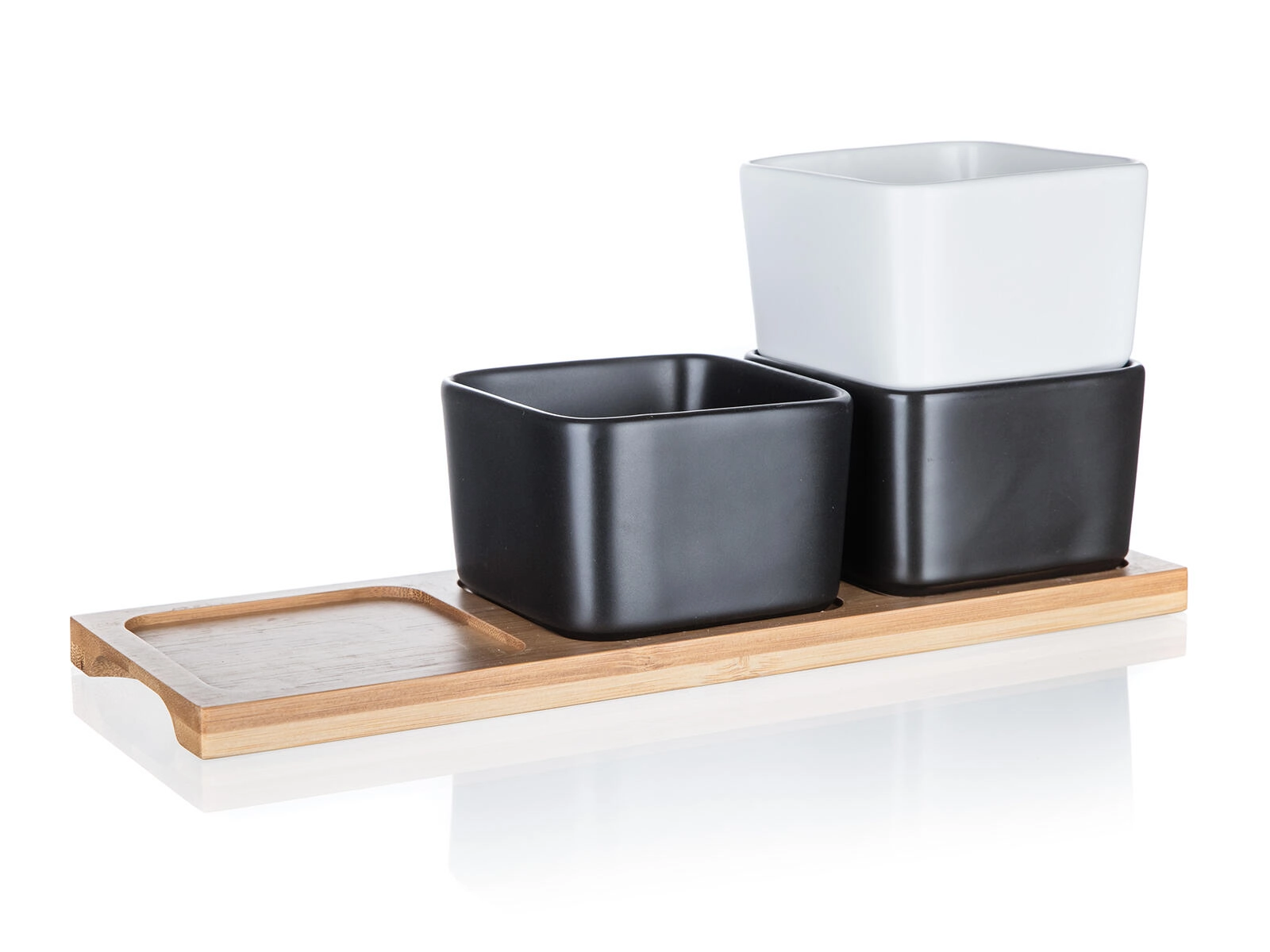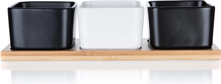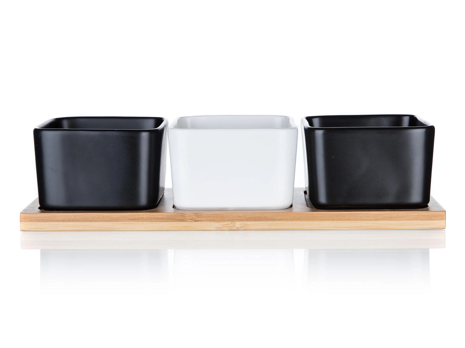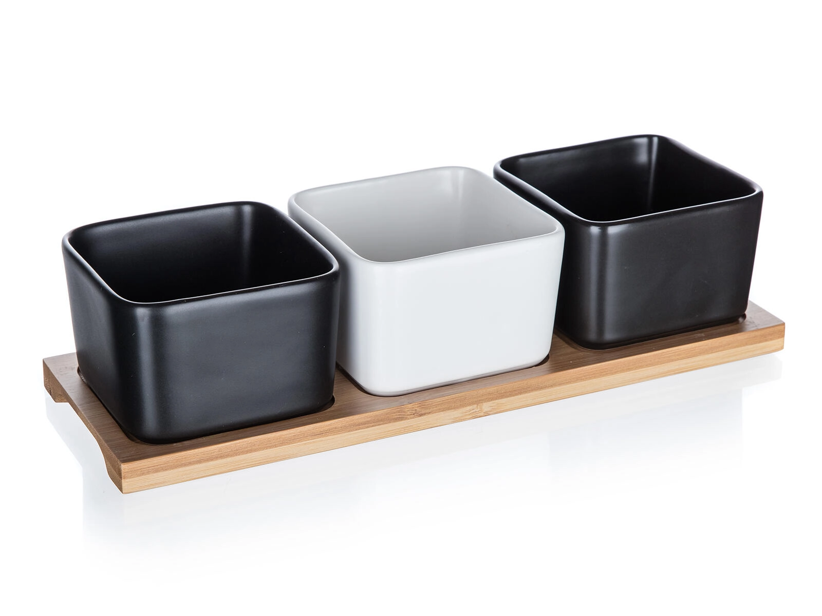 Elegáns készlet három szögletes porcelán tálkával bambusz tálcán, ideális mártogatósok, szószok, olívabogyók vagy magvak tálalásához. A 2 fekete és 1 fehér tálka kombinációja modern megjelenést ad az asztalnak, a könnyű karbantartás mosogatógépben és a mikrohullámú sütőben való használhatóság pedig mindennapi praktikusságot biztosít.