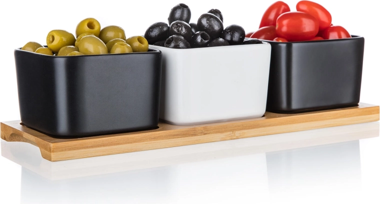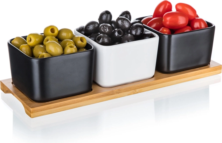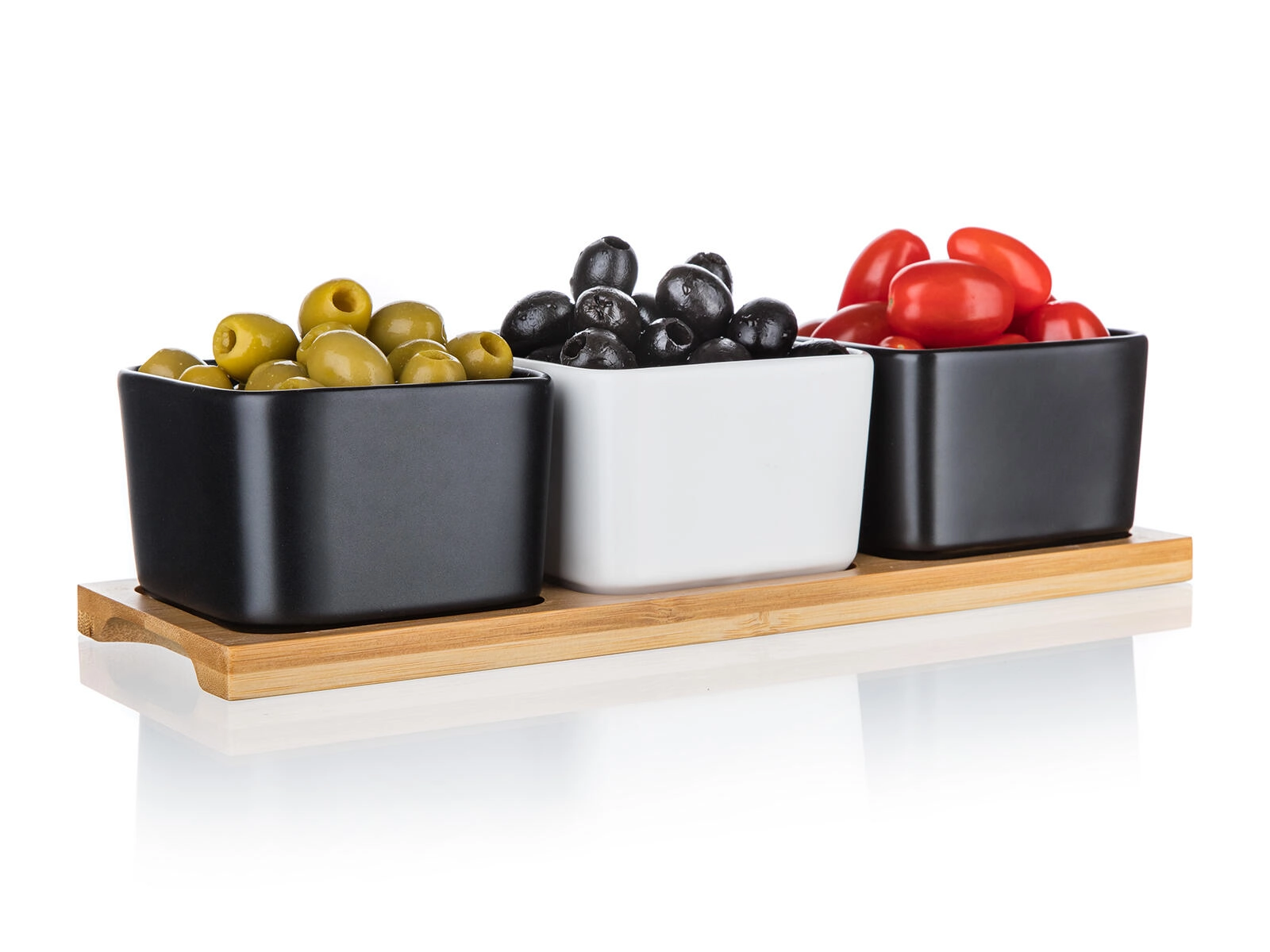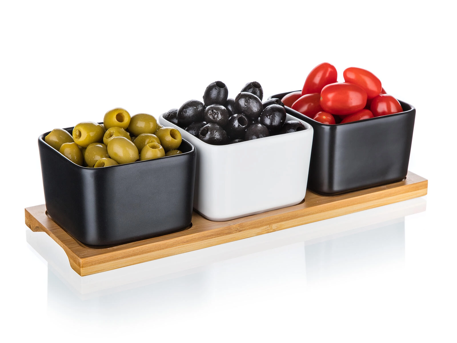 Elegáns készlet három szögletes porcelán tálkával bambusz tálcán, ideális mártogatósok, szószok, olívabogyók vagy magvak tálalásához. A 2 fekete és 1 fehér tálka kombinációja modern megjelenést ad az asztalnak, a könnyű karbantartás mosogatógépben és a mikrohullámú sütőben való használhatóság pedig mindennapi praktikusságot biztosít.