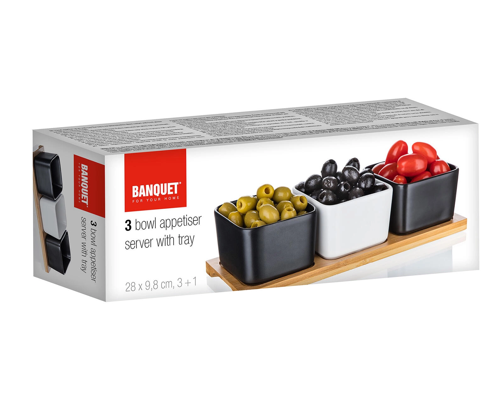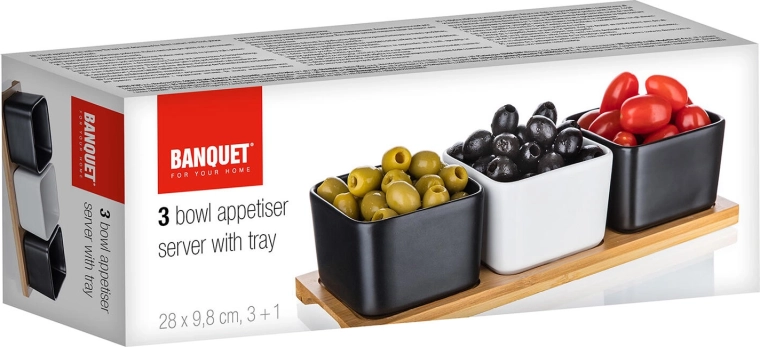 Ez a stílusos BRILLANTE tálalókészlet időtálló fekete-fehér porcelán kerámiát ötvöz a természetes bambusszal. A három négyzet alakú tálka stabilan ül a tálcán, így kényelmesen vihető a konyhából az asztalra. Remek választás vendégváráshoz – az olívabogyótól és aszalt gyümölcstől a szószokig és mártogatósokig.
