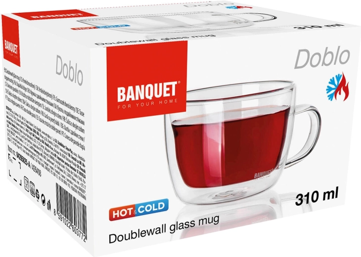 Élvezze kedvenc forró és hideg italait stílusosan. A DOBLO duplafalú bögre 310 ml űrtartalommal tiszta üvegből készült, amely kiemeli az ital színét, és a szigetelő rétegnek köszönhetően optimális hőmérsékletet segít fenntartani hosszabb ideig. A kényelmes fül és a kellemesen hűvös külső felület növeli az ivási komfortot.