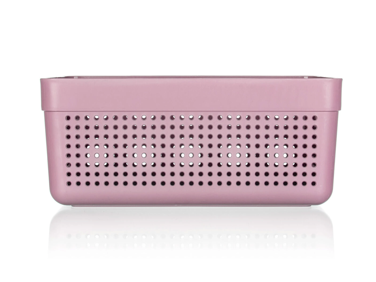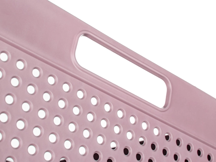 A TERRA praktikus tárolókosár 32,5 × 23,5 × 14 cm méretben segít rendet tartani otthon és az irodában is. A masszív műanyag szerkezetnek, a beépített fogantyúknak és a perforált oldalfalaknak köszönhetően könnyű, szellős és egyszerűen hordozható. Ideális kozmetikumokhoz, irodaszerekhez, apró játékokhoz vagy éléskamrában tárolt élelmiszerekhez. Színkeverékben – rózsaszín és szürke kivitelben kapható.