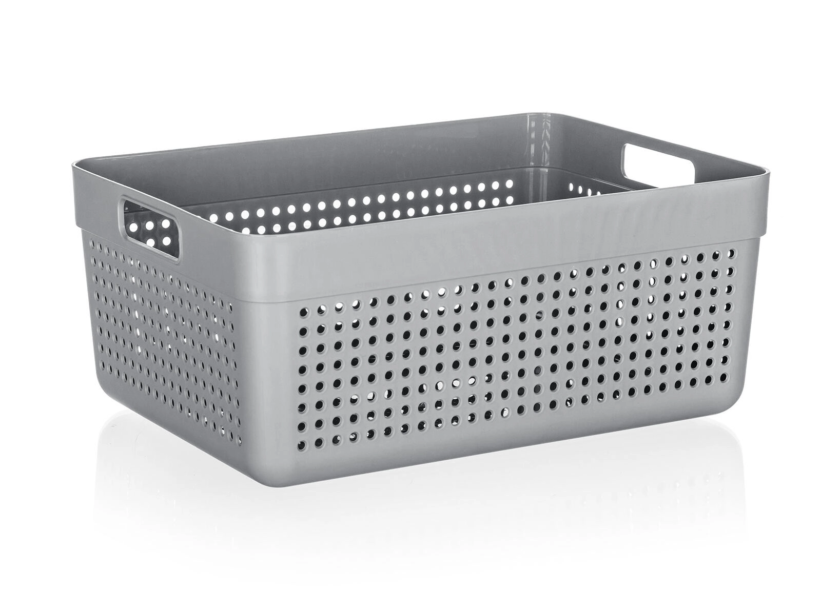 A strapabíró műanyagnak köszönhetően a kosár könnyű, könnyen tisztítható és alkalmas a mindennapos használatra. Az integrált fogantyúk kényelmes hordozást tesznek lehetővé még teljes terhelés mellett is. A 32,5 × 23,5 × 14 cm-es méret elegendő helyet biztosít kozmetikumoknak, tisztítószereknek, irodai kiegészítőknek vagy élelmiszereknek.