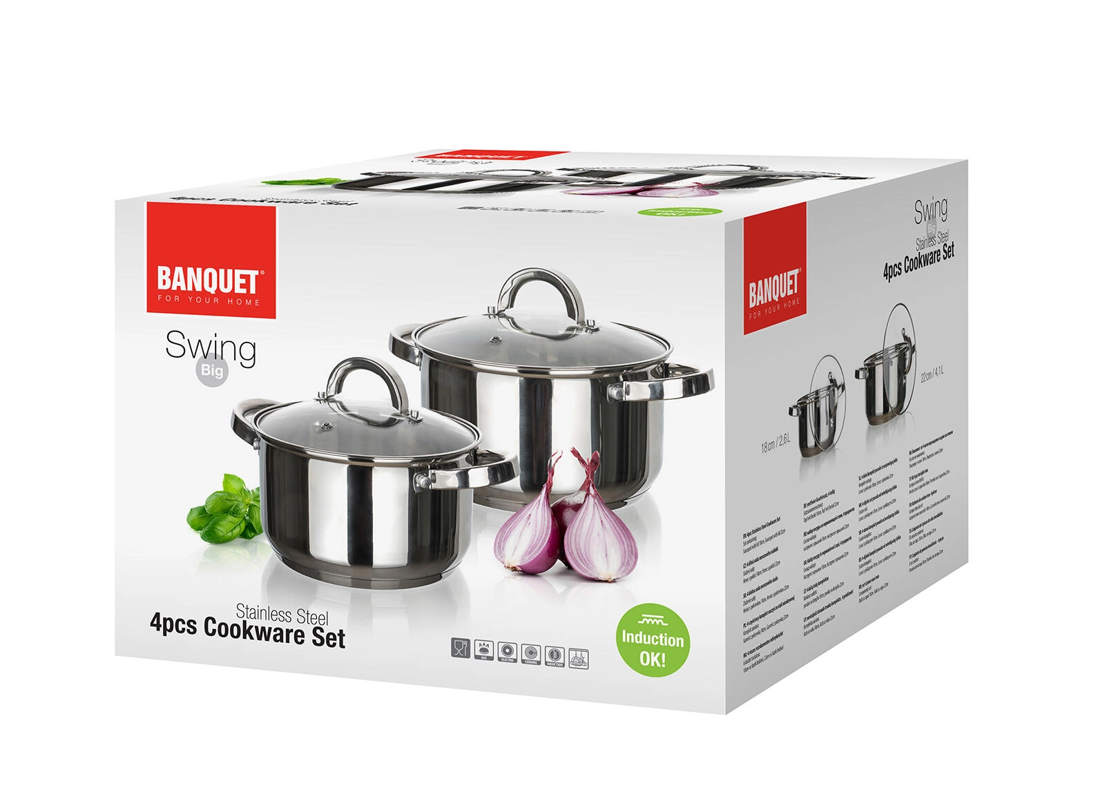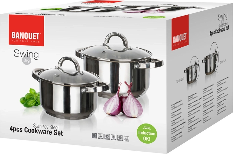 A SWING univerzális rozsdamentes acél edénykészlet a mindennapi főzéshez két edényt tartalmaz 2,6 l és 4,1 l űrtartalommal, beleértve az üvegfedőket gőzkivezető nyílással. Alkalmas minden tűzhelytípushoz, beleértve az indukciót is, polírozott rozsdamentes acél felülettel belül és kívül, valamint mosogatógépben mosható a könnyű karbantartásért.