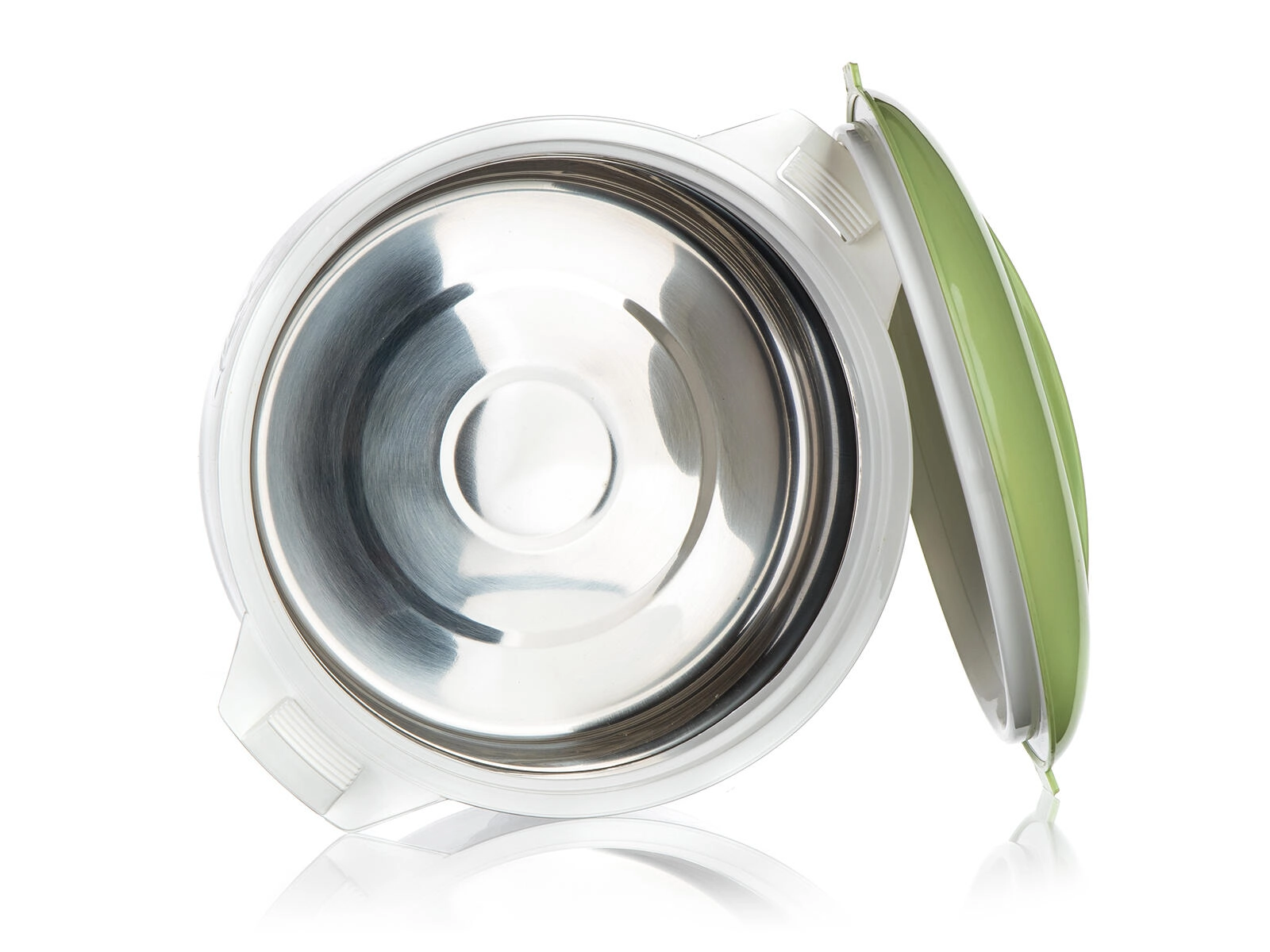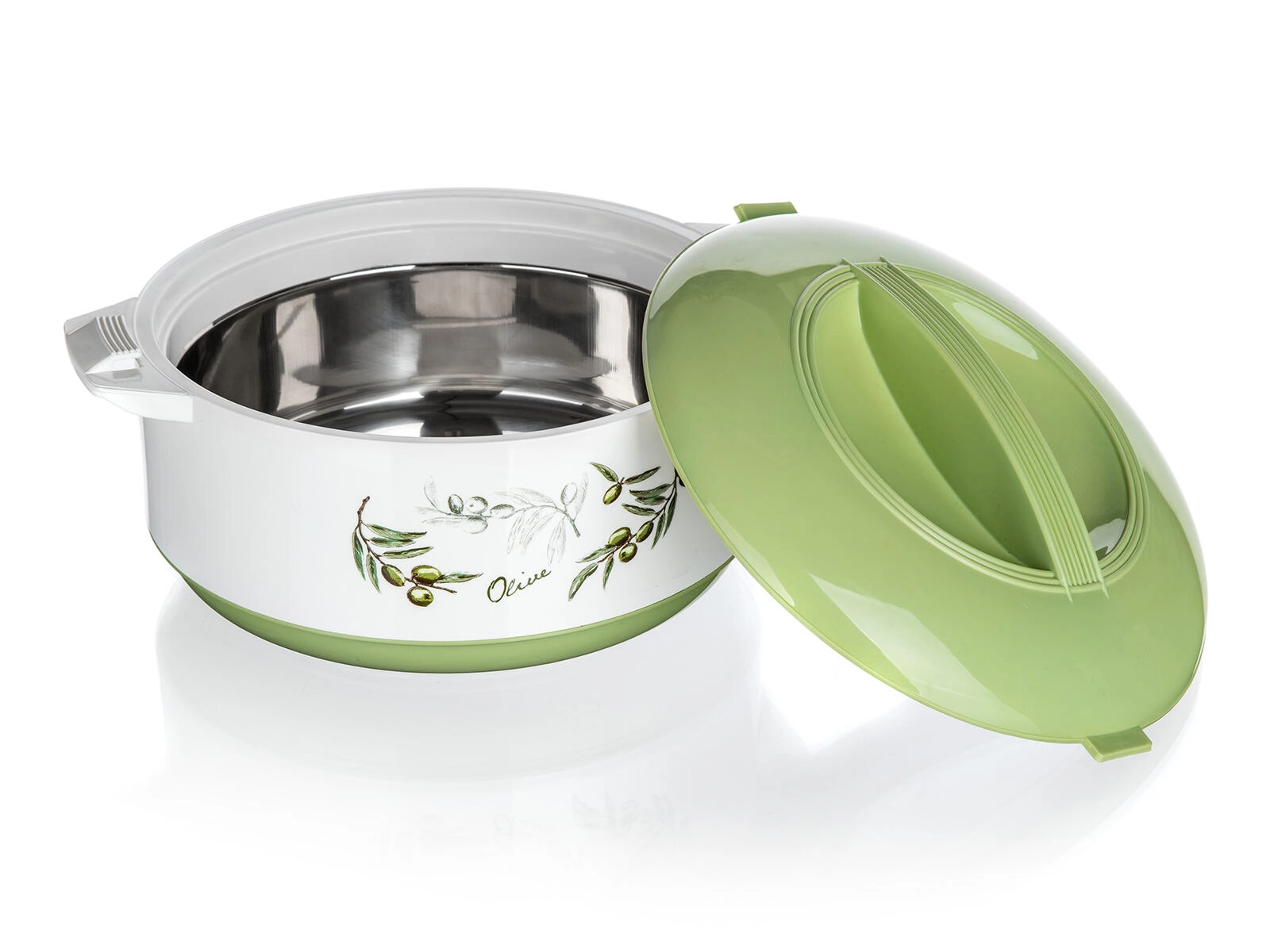 Az olívás dizájn, a masszív fedél és a praktikus oldalsó fogantyúk biztonságos szállítást tesznek lehetővé felesleges hőveszteség nélkül. A termos tál tökéletes választás azoknak a házi szakácsoknak, akik szeretnék, ha az elkészült ételek a megfelelő pillanatban tálalásra készen állnának.