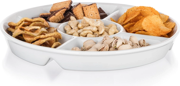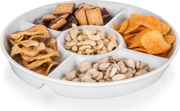 Több rekesz teszi lehetővé a különféle finomságok tálalását anélkül, hogy az ízek keverednének – ideális diphez, snackekhez és crudités-hez.