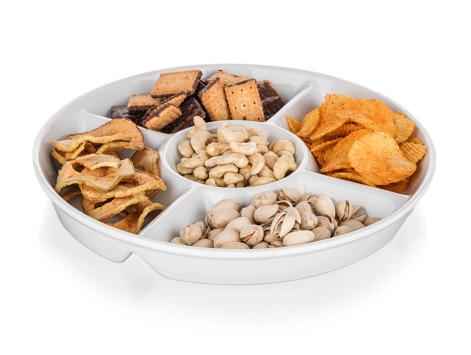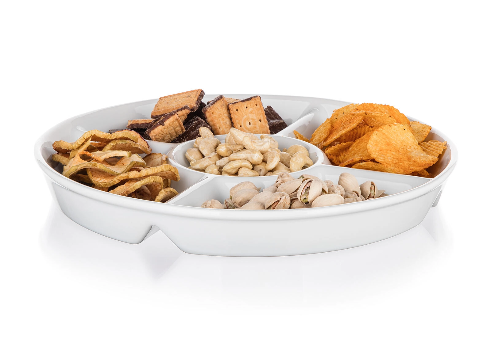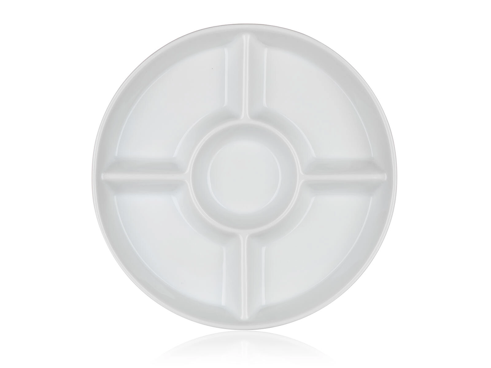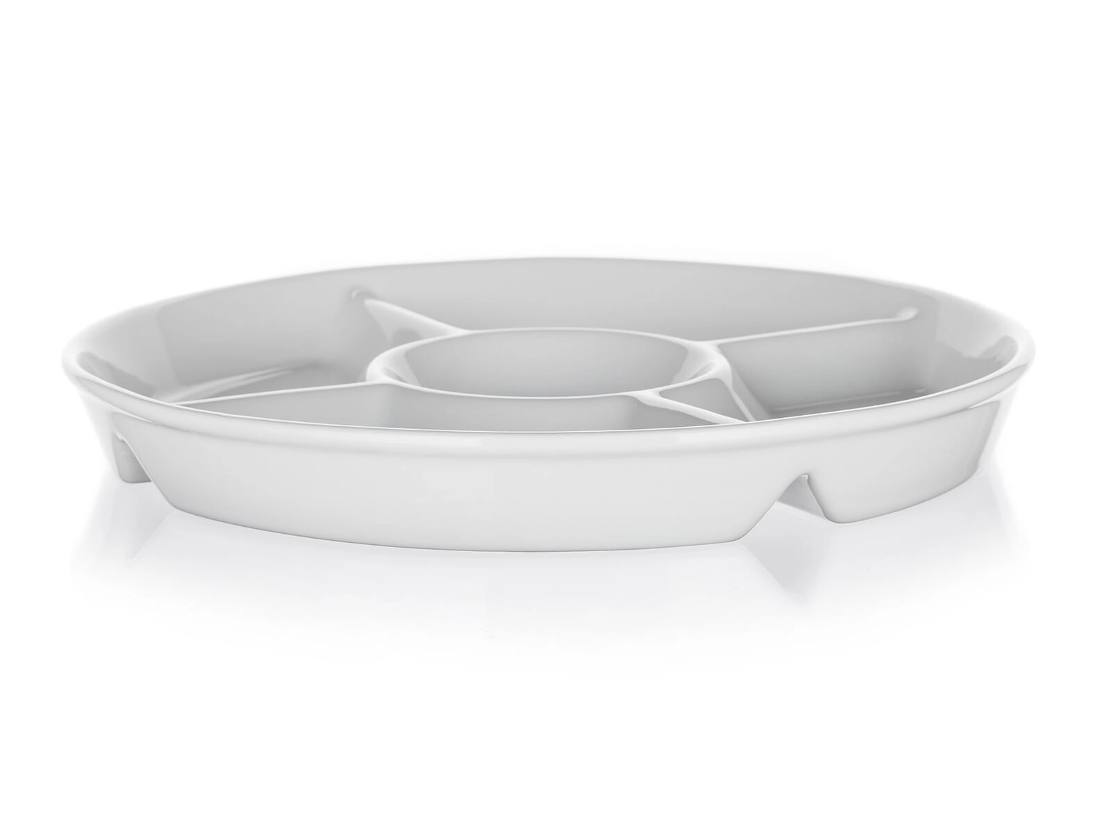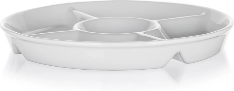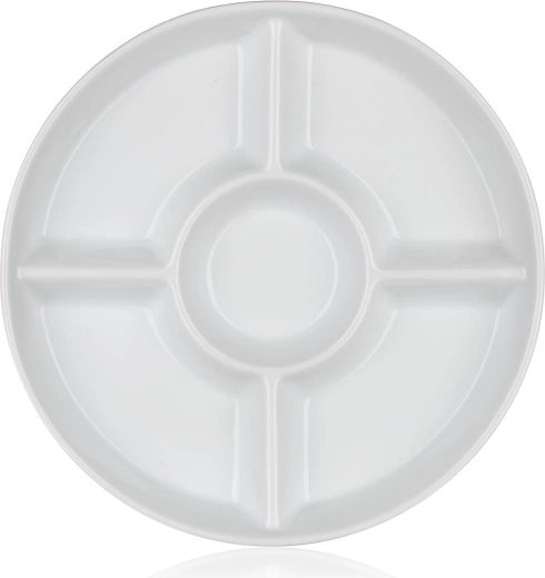 Elegáns, kiváló minőségű porcelánból készült BIANCA osztott szervírozó tál 30 cm átmérővel, univerzális fehér színben. A praktikus rekeszek elkülönítik az ízeket – ideális diphez, diófélékhez, chipshez, gyümölcshöz és zöldséghez is. Könnyen tisztítható, mosogatógépben mosható, kiváló a mindennapi használathoz és vendéglátáshoz.