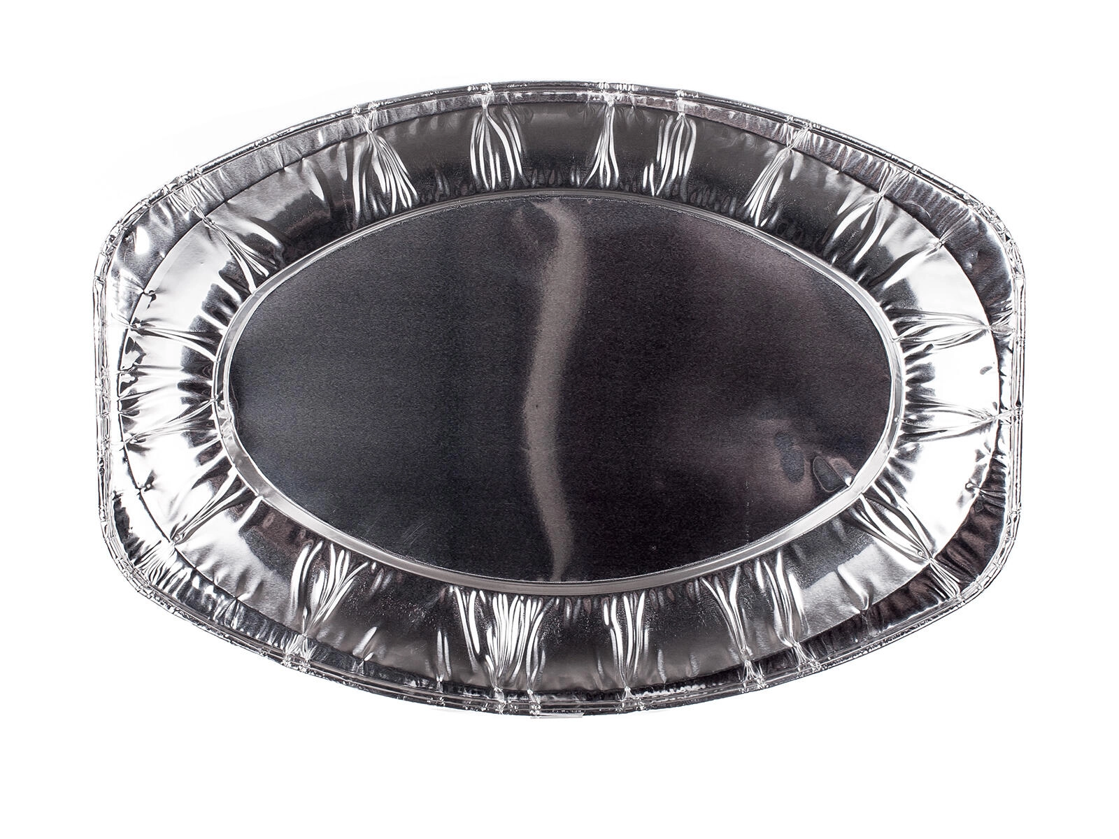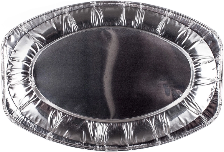 Praktikus, ovális alumínium szervírozó tálca 33,5 × 23,5 cm méretben, 2 darabos csomagolásban, ideális grillezéshez, sütéshez és tálaláshoz. A könnyű és tartós anyag kényelmes kezelést és higiénikus ételkínálást biztosít. Alkalmas húsok és egyéb ételek grillezésére, alacsony tömeg és könnyű ártalmatlanítás vagy újrahasznosítás használat után.