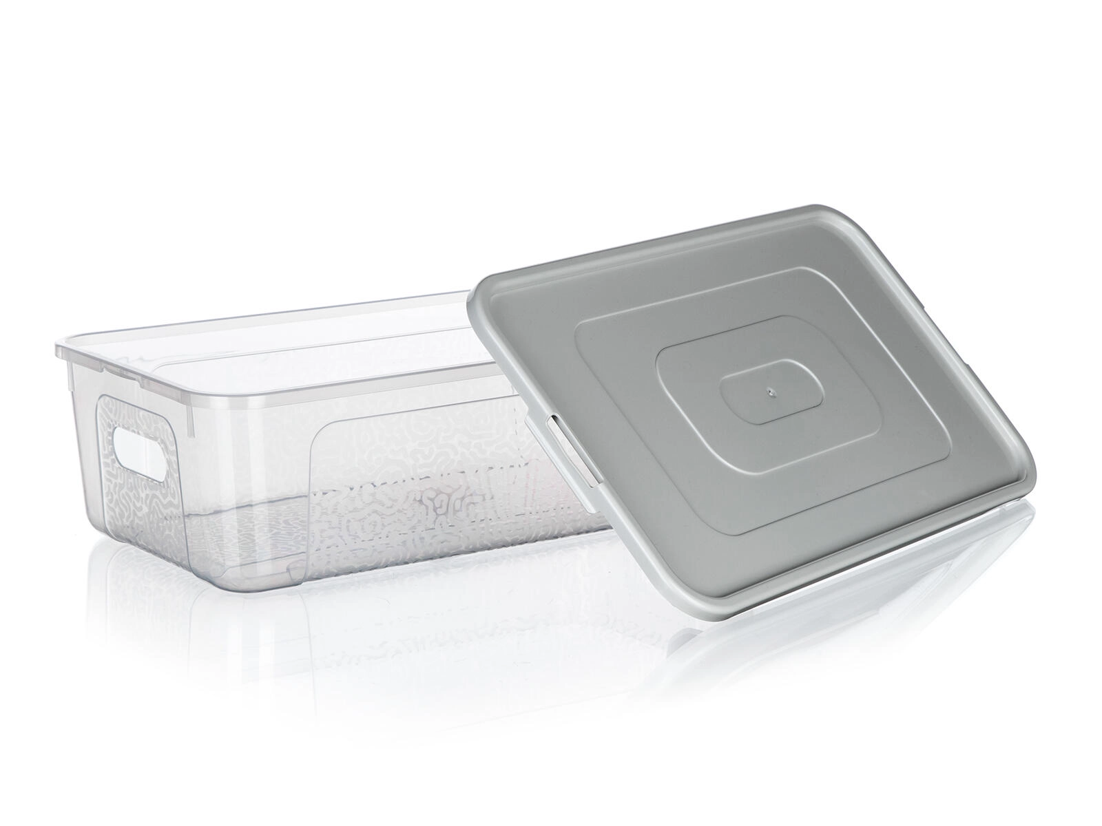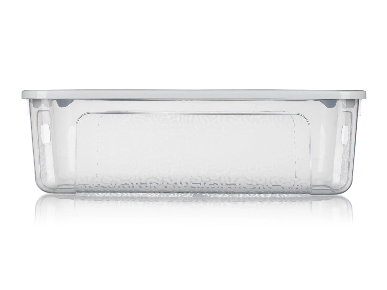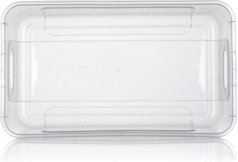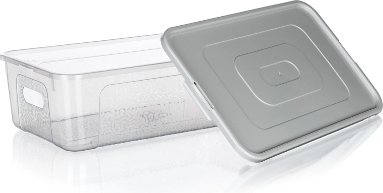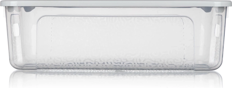 A doboz strapabíró műanyagból készült, integrált oldalsó fogantyúkkal rendelkezik a könnyű kezelhetőség érdekében, és alacsony, téglalap alakú formájának köszönhetően polcokra és ágy alá is illik. A fedél megbízhatóan a helyén marad, így a tárolt tárgyak védettek a portól és a kiszóródástól.