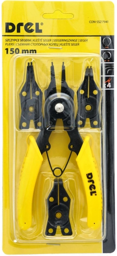 Univerzális DREL biztosító (seeger) gyűrű fogó 150 mm-es hosszban a pontos és kényelmes munkavégzéshez. A cserélhető pofáknak köszönhetően alkalmas belső és külső seeger gyűrűkhöz, továbbá gyors pofacsere és ergonomikus markolat biztosítja a biztonságos fogást.