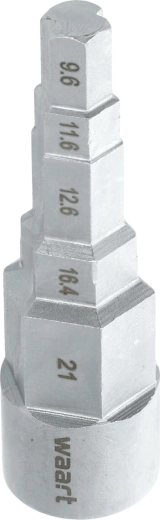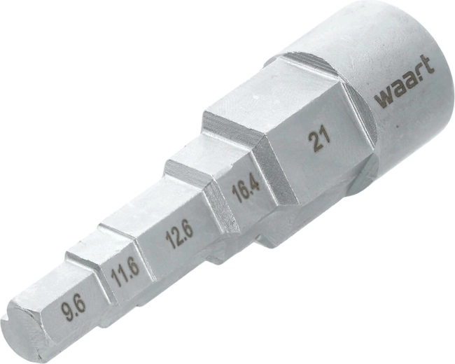 A lépcsőzetes kialakítás lehetővé teszi a gyors váltást a 3/8", 29/68", 1/2", 21/32" és 27/32" (9,6–21 mm) méretek között anélkül, hogy szerszámot kellene cserélni.