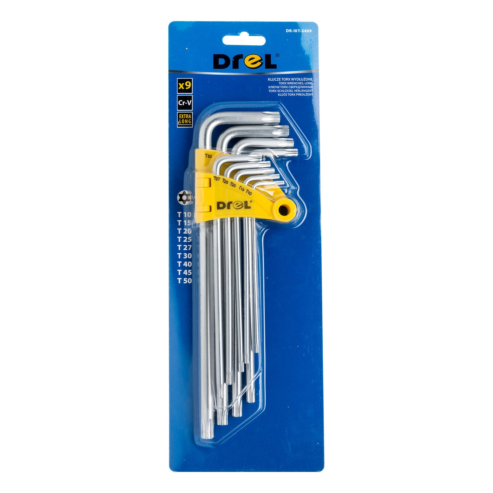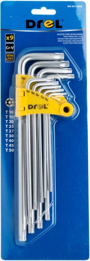 A DREL hosszított TORX kulcskészlete ideális választás műhelybe, szervizbe és otthoni felhasználásra. Az S2 acélból készült, precíz hegyek magas keménységet, kopásállóságot és hosszú élettartamot nyújtanak. A kulcsok megnövelt hossza megkönnyíti a munkát korlátozott hozzáférésű helyeken.