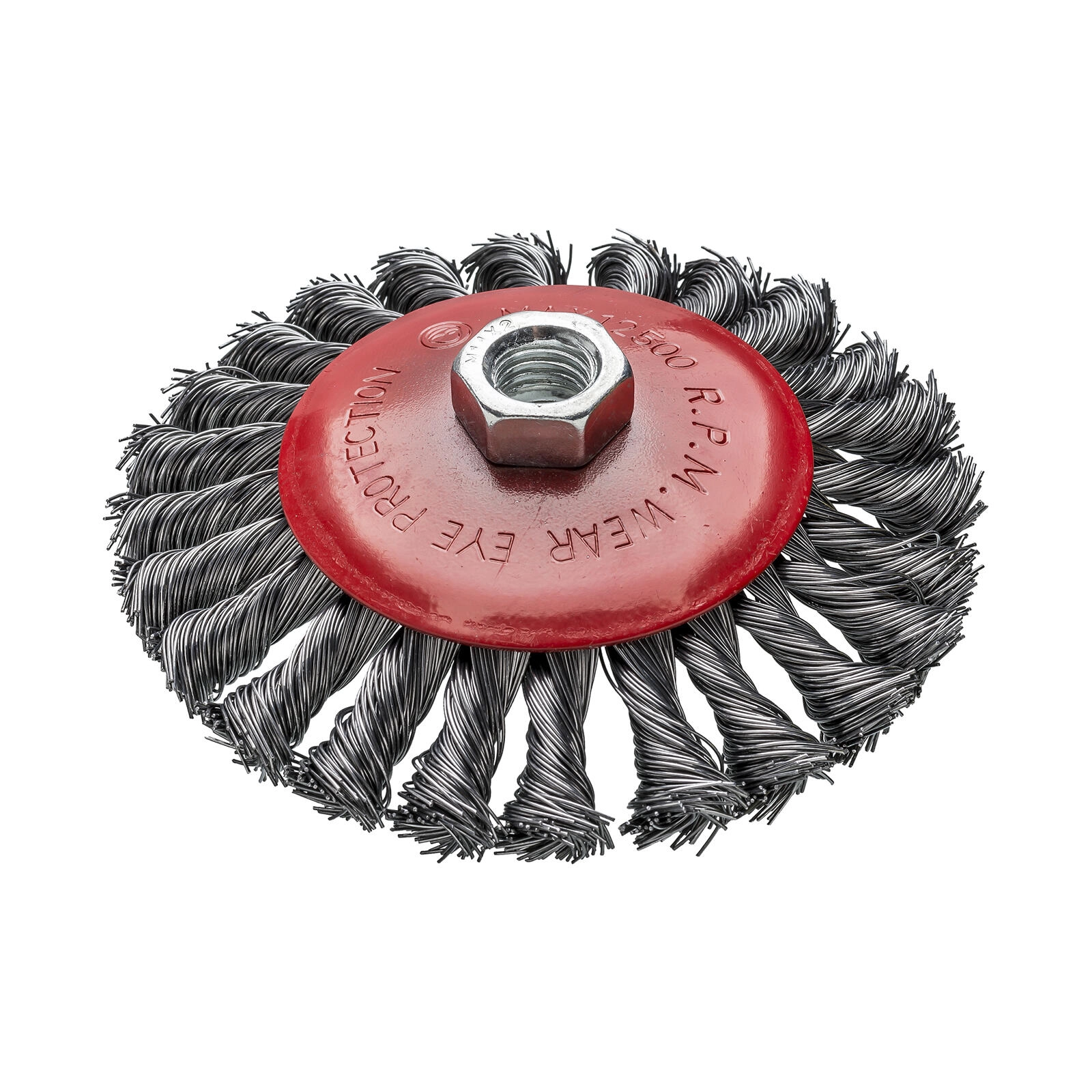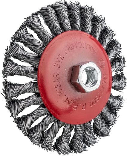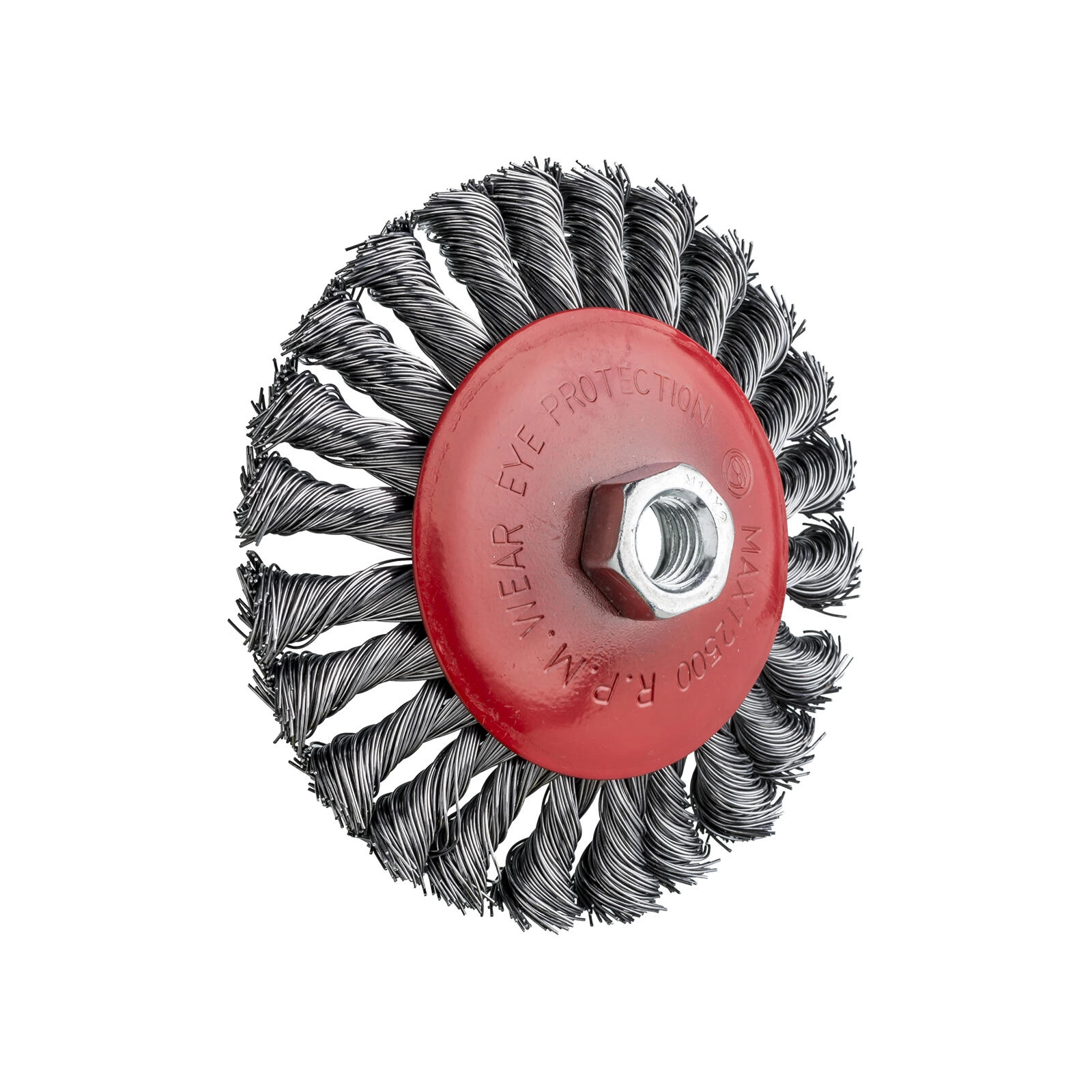 Nagy teljesítményű tányérkefe M14 menettel sarokcsiszolókhoz, rozsda, régi festékrétegek és erős szennyeződések eltávolítására. A 0,3 mm-es sodrott acélhuzal agresszív tisztítást és hosszú élettartamot biztosít, míg a tányér forma megkönnyíti a munkát még a nehezen hozzáférhető helyeken is.