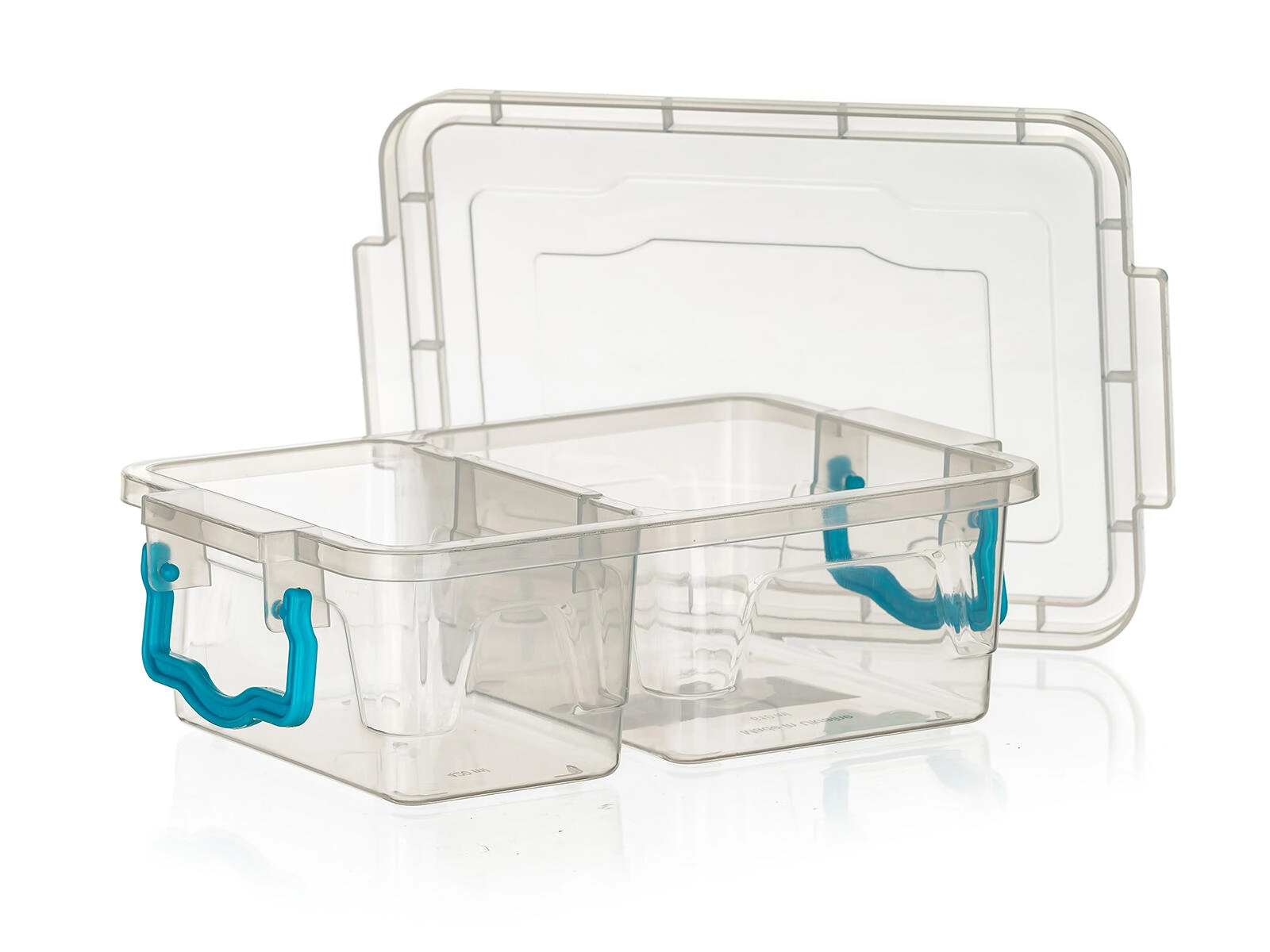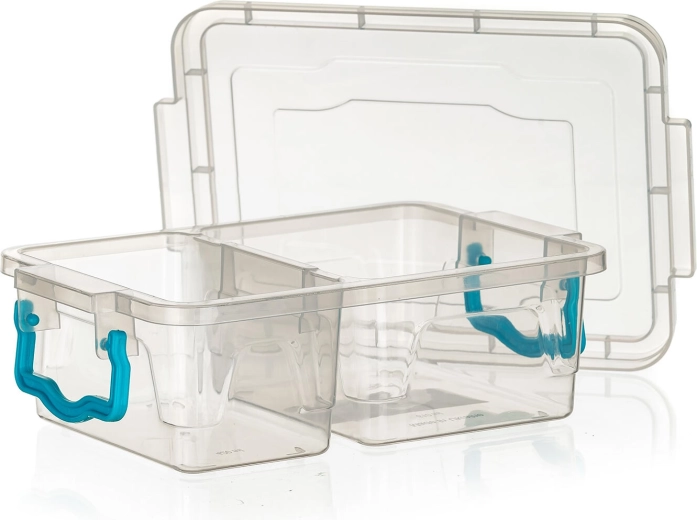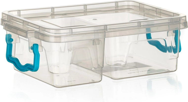 - Átlátszó doboz, türkiz fogantyúk