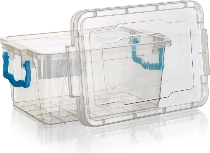 Praktikus, 1,5 l űrtartalmú konyhai doboz, amely otthoni és útközbeni élelmiszer-tárolásra is alkalmas. A átlátszó kivitelnek köszönhetően mindig jól látható a tartalom, a masszív, türkiz fogantyúk pedig biztos zárást garantálnak. Alkalmas fagyasztóba -25 °C-ig és mikrohullámú sütőbe +95 °C-ig.