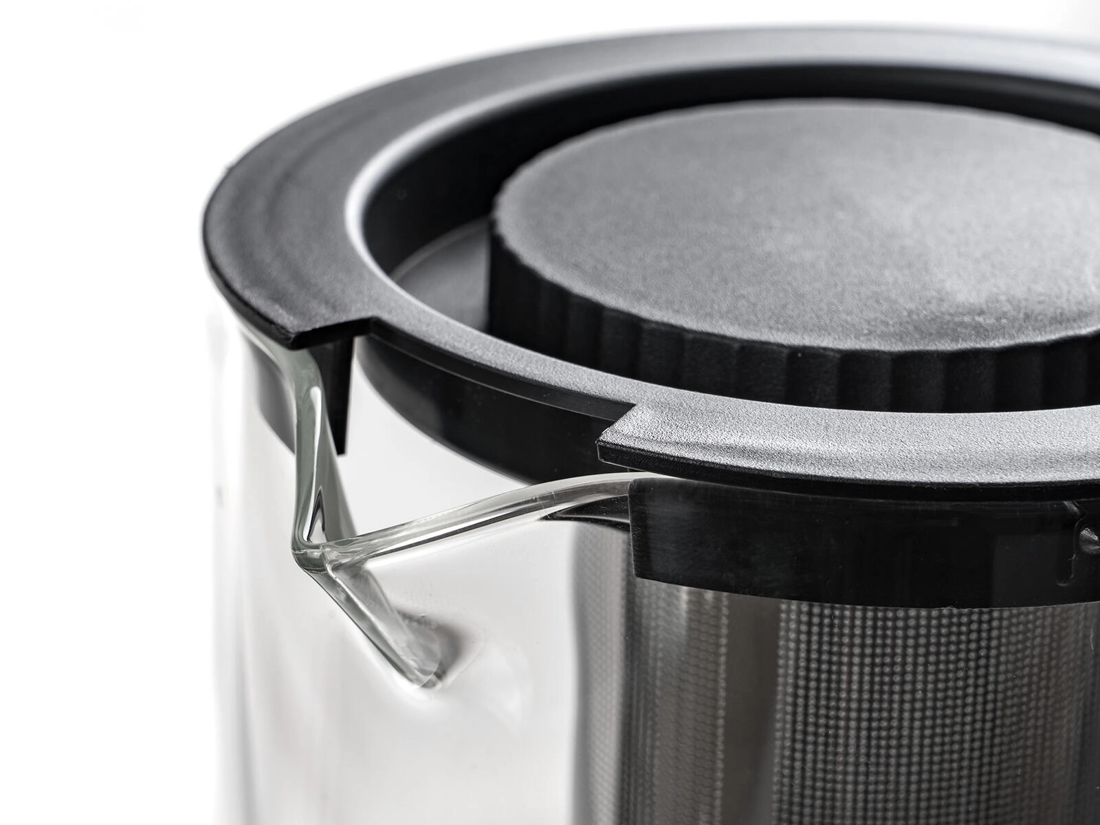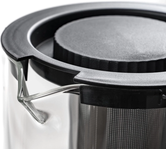 A kivehető rozsdamentes acél szűrő bent tartja a gyümölcsöt, a gyógynövényeket és a teat leveleket, így csak tiszta italt önt ki, maradékok nélkül.