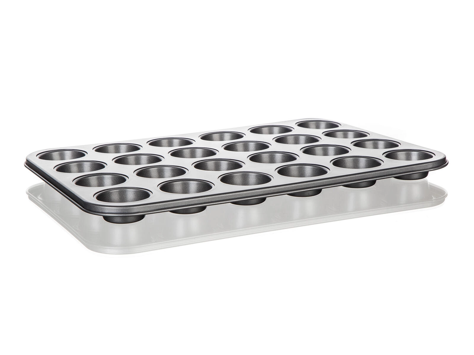 A kompakt 37,8 × 26 × 2 cm méretnek köszönhetően a tepsi a legtöbb háztartási sütőbe belefér. Az ezüstszürke külső és belső felület kifejezetten tartós a kopással szemben. Süssön tökéletesen egyenletes mini desszerteket odaégés nélkül, minimális zsiradékkal.