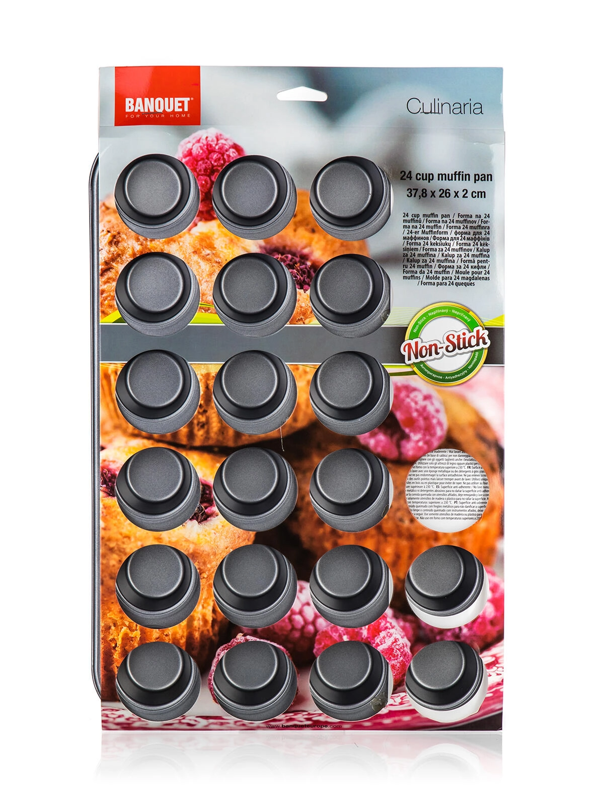 24 darabos CULINARIA mini fánk sütőlemez tartós szénacélból, XYNFLON tapadásmentes felülettel PTFE alapon a könnyű kifordításért és az egyenletes sütésért. Praktikus méret: 37,8 × 26 × 2 cm, ezüstszürke kivitel a mindennapi sütéshez odaégés és bonyolult tisztítás nélkül.