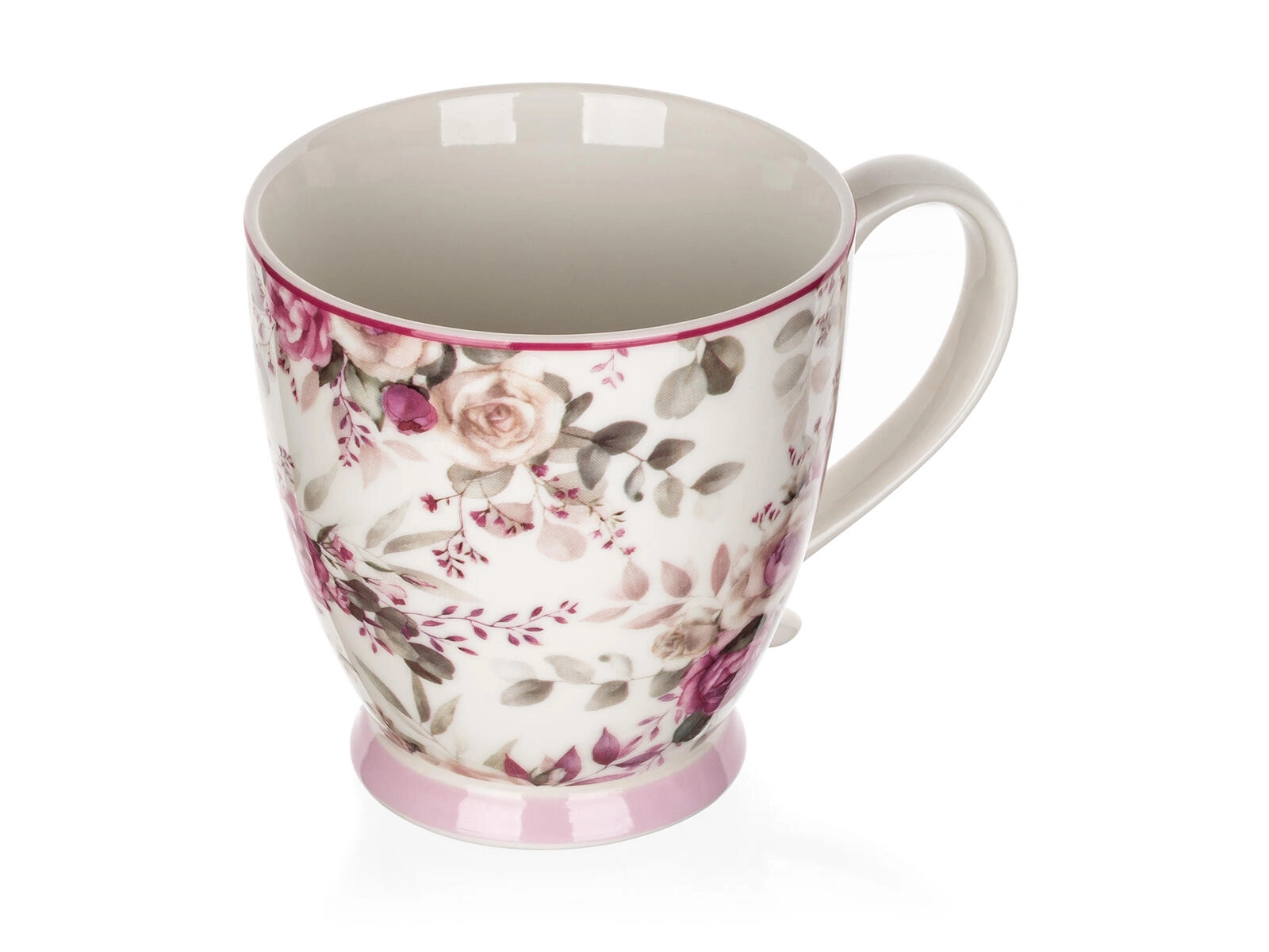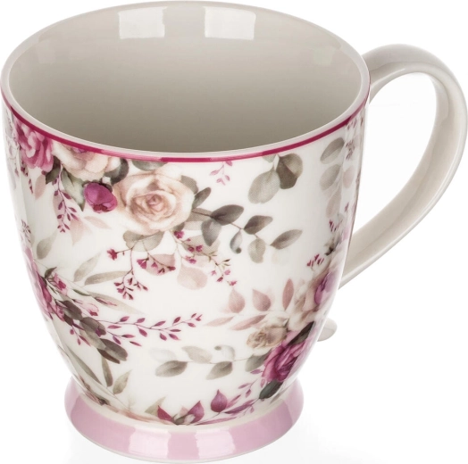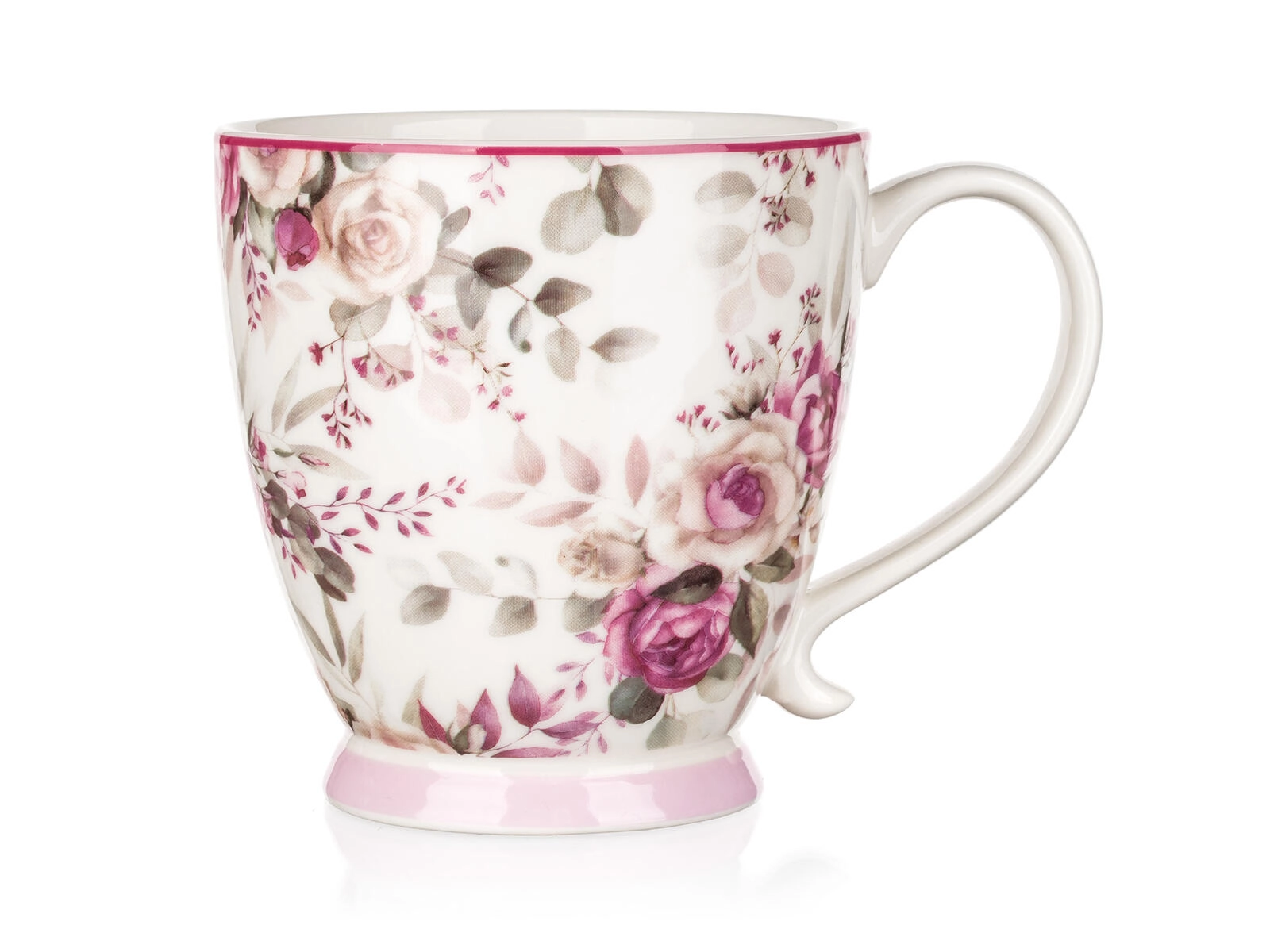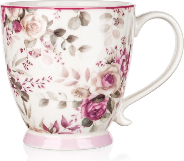 Elegáns ROSE kerámia bögre 460 ml űrtartalommal, finom virágmintával, mindennapi használatra és ünnepi pillanatokra egyaránt ideális. A minőségi máznak köszönhetően mikrohullámú sütőben használható és mosogatógépben mosható. A rózsákkal díszített stílusos design romantikus hangulatot kölcsönöz az asztalterítésnek, és remek választás teához, kávéhoz és forró csokihoz is.