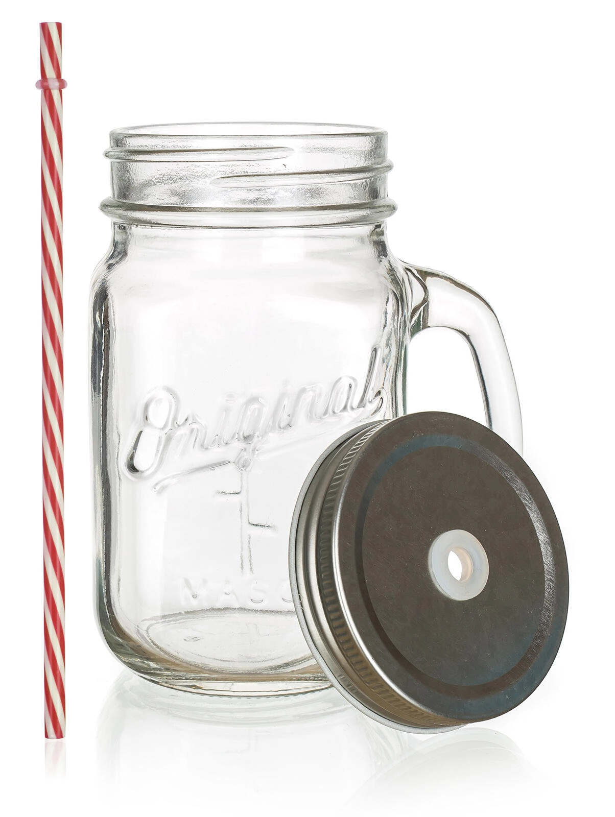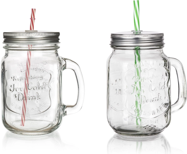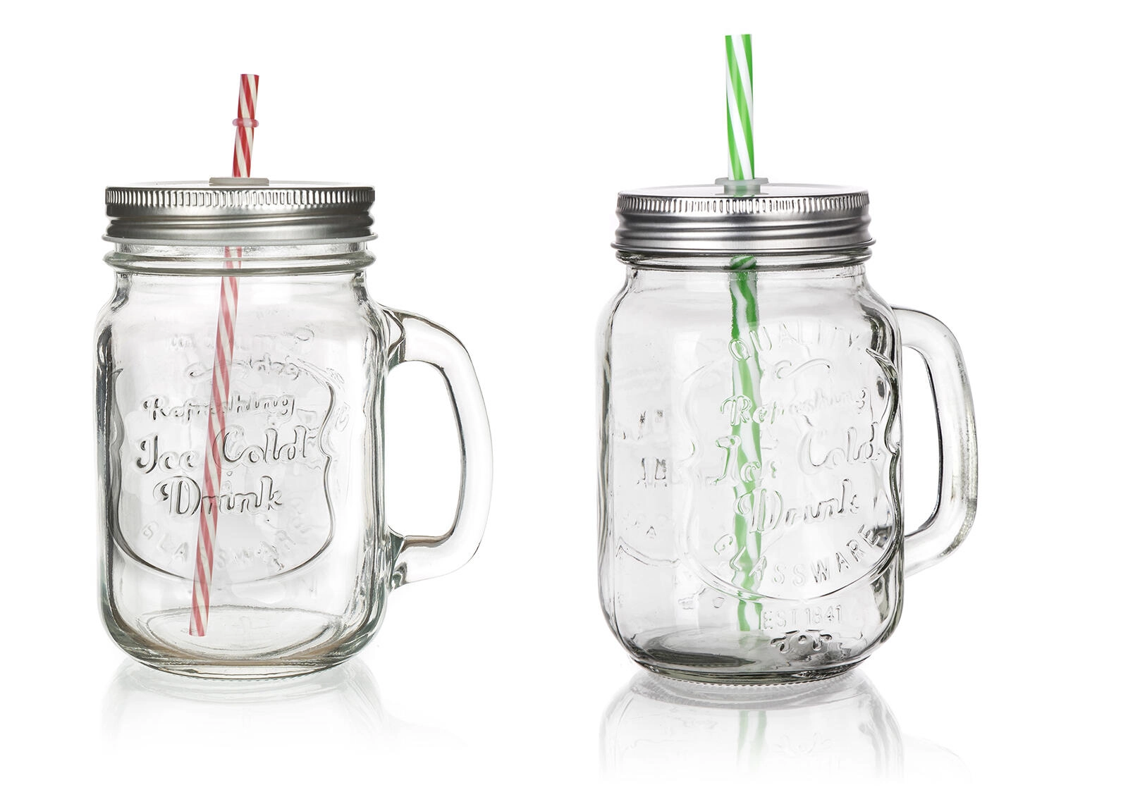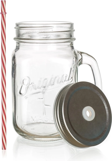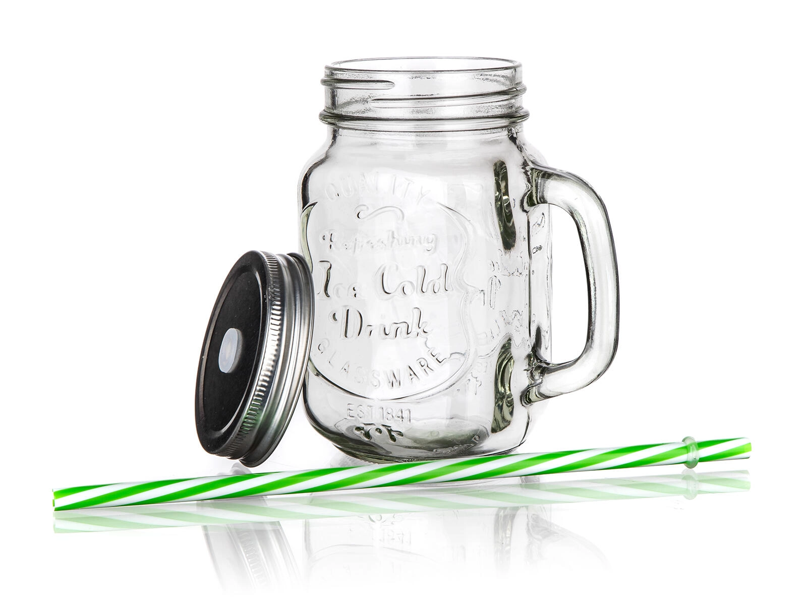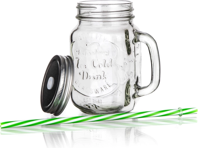 Stílusos MADEIRA üvegbögre 450 ml űrtartalommal, füllel, menetes fém fedővel és újrahasználható szívószállal – ideális limonádékhoz, jeges teákhoz és koktélokhoz. A kiömlésgátló fedőnek és a kényelmes fülnek köszönhetően tökéletes kerti ünnepségekre, nyári partikra és esküvőkre.