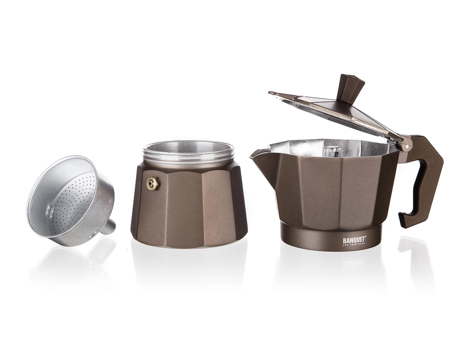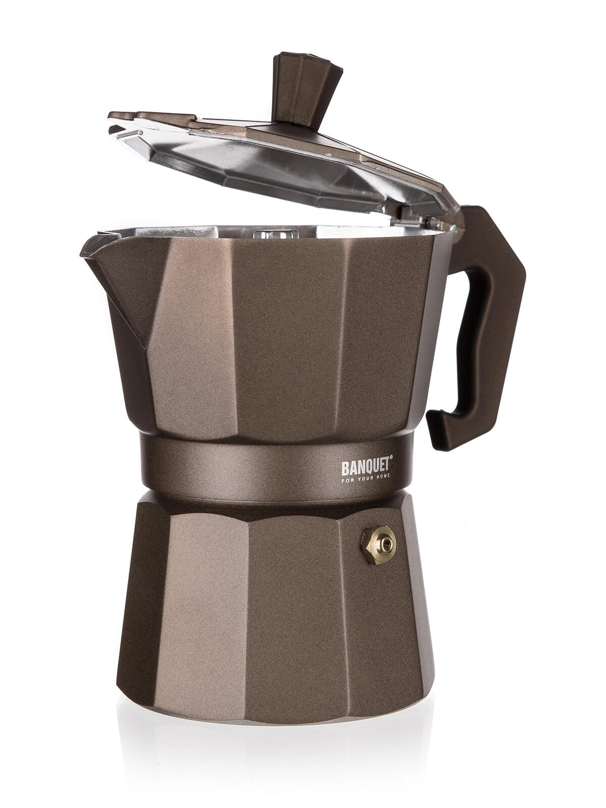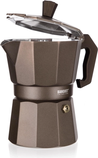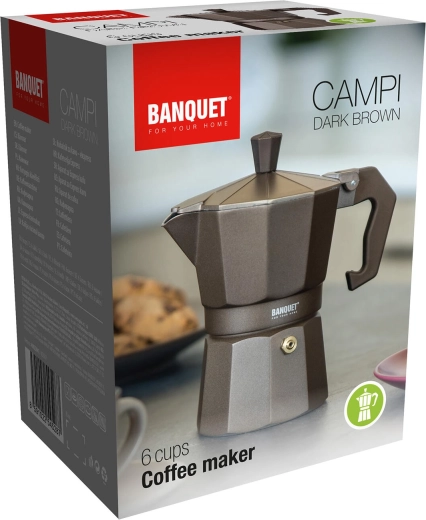 Élvezze a hamisítatlan eszpresszó stílust a BANQUET CAMPI moka kávéfőzővel. A klasszikus alumínium konstrukció gyorsan vezeti a hőt, néhány használat után finom patinát kap az autentikus kávéíz érdekében. A biztonsági szelepnek és a kényelmes fogantyúnak köszönhetően a kávékészítés egyszerű és biztonságos.