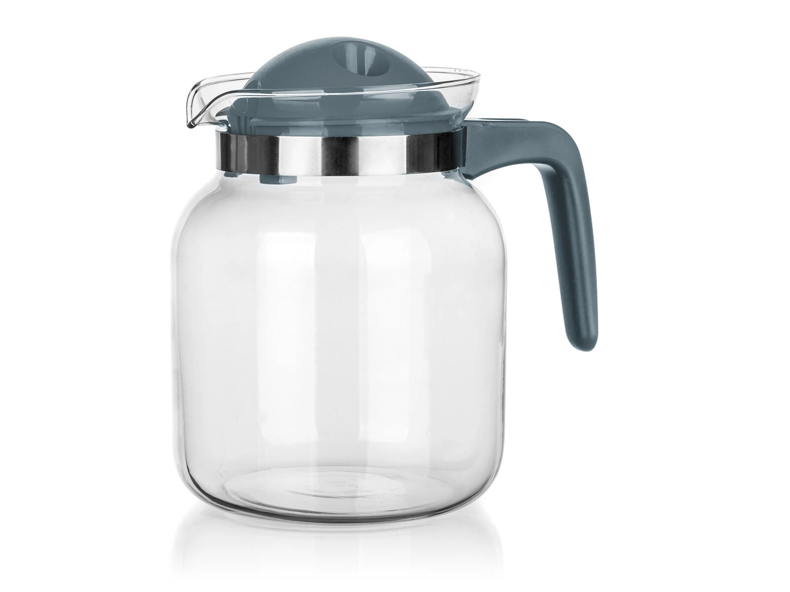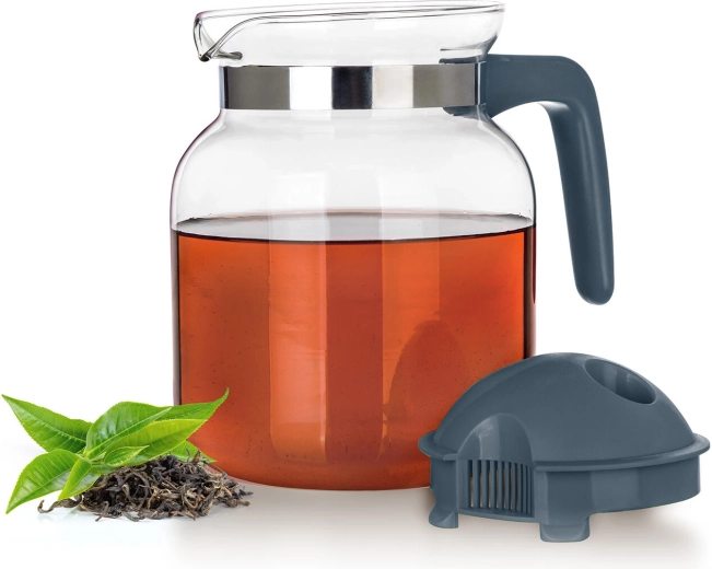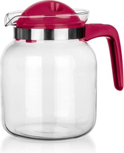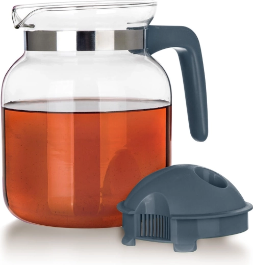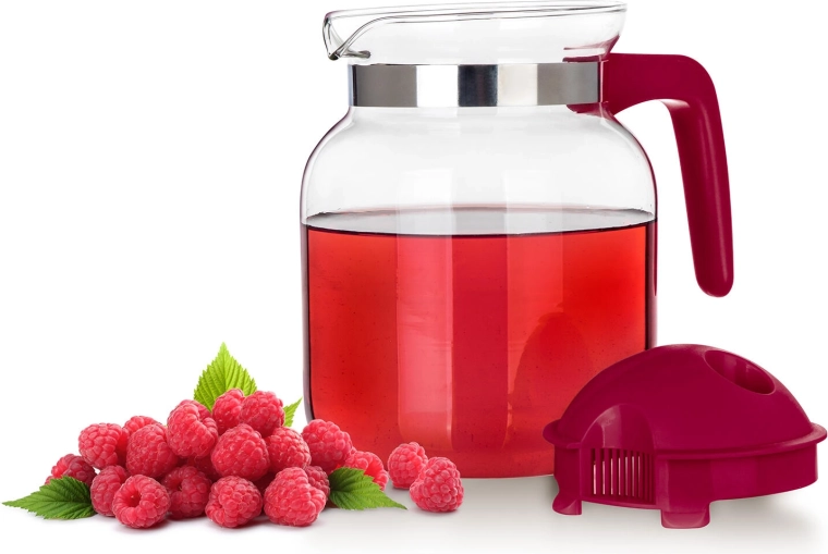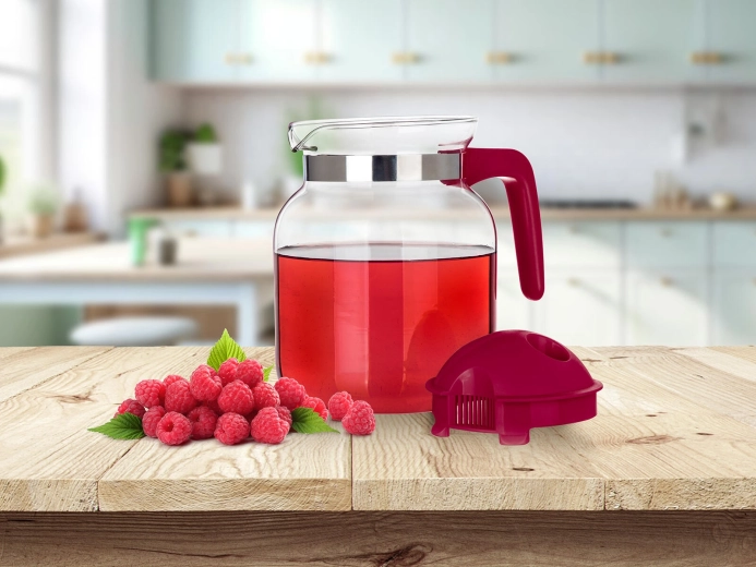 A levehető műanyag tető integrált kiöntőrendszerrel és szűrőnyílásokkal segít visszatartani a jégdarabokat, a gyümölcsöt vagy a szálas teát, és egyenletes, cseppmentes áramlást biztosít. A nyaknál lévő fémgyűrű modern megjelenést kölcsönöz a kancsónak, és hozzájárul a biztos fogáshoz.