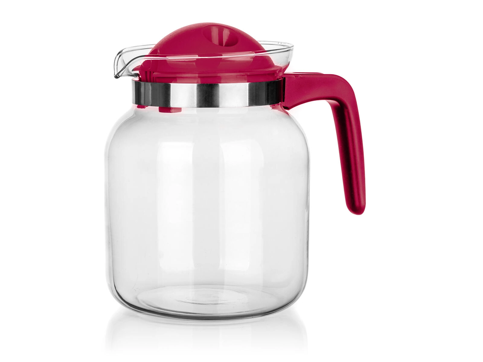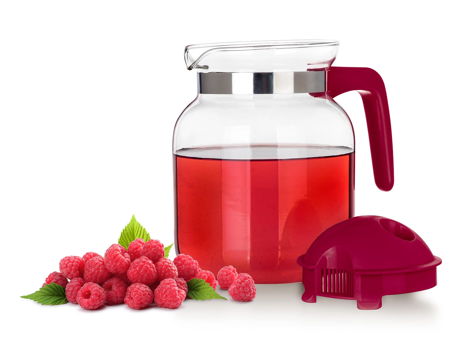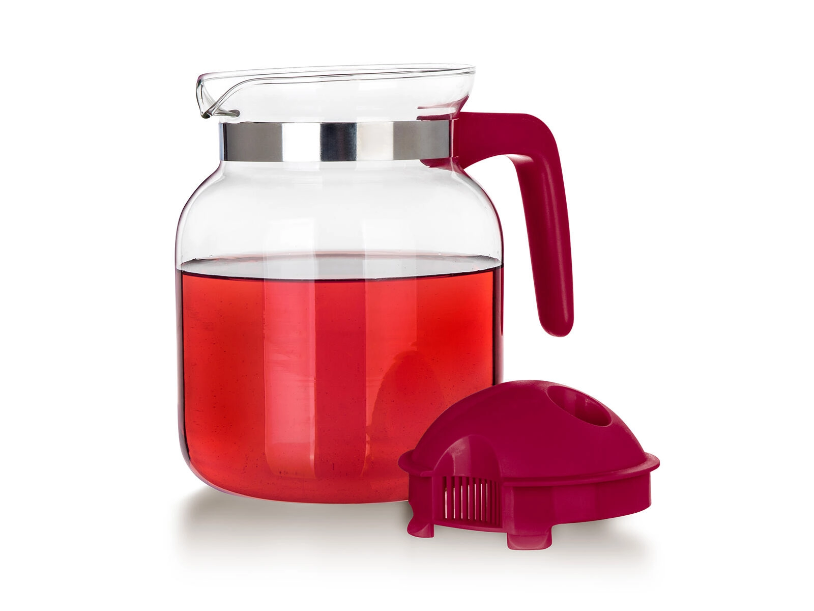 A levehető műanyag tető integrált kiöntőrendszerrel és szűrőnyílásokkal segít visszatartani a jégdarabokat, a gyümölcsöt vagy a szálas teát, és egyenletes, cseppmentes áramlást biztosít. A nyaknál lévő fémgyűrű modern megjelenést kölcsönöz a kancsónak, és hozzájárul a biztos fogáshoz.