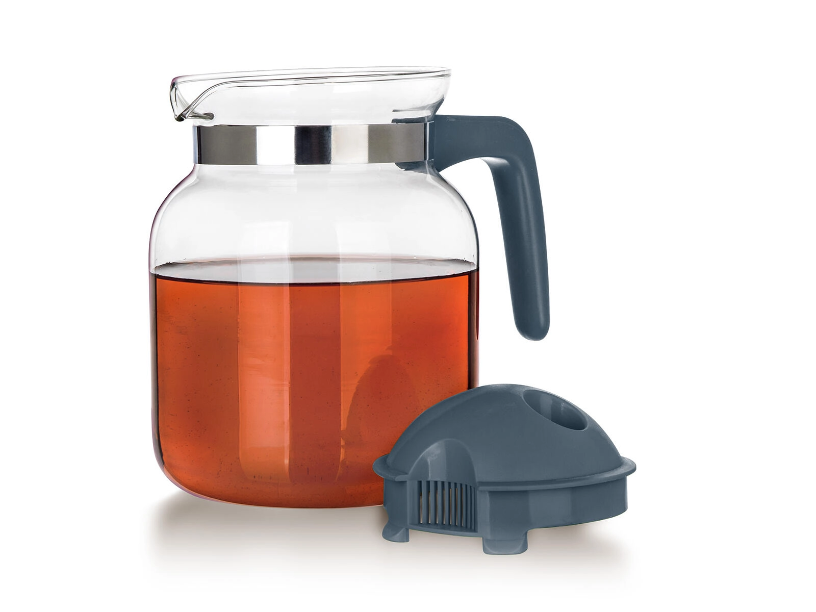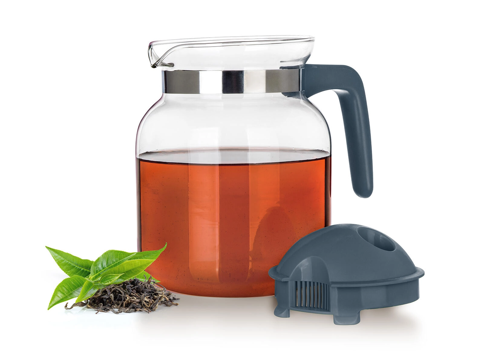A levehető műanyag tető kiöntőrésszel és finom nyílásokkal felfogja a gyümölcsöt, jeget és a tealeveleket, így cseppmentes, tiszta kiöntést biztosít.
