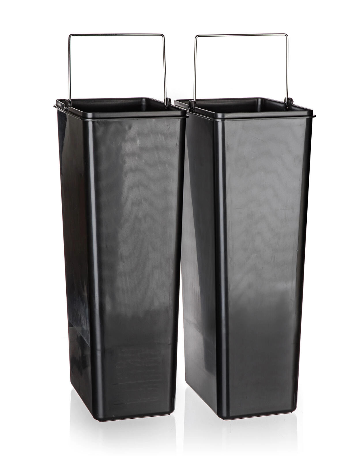 A fogantyús műanyag betétek egyszerűen kivehetők, a zsák könnyen cserélhető, a kuka pedig makulátlanul tisztán tartható.