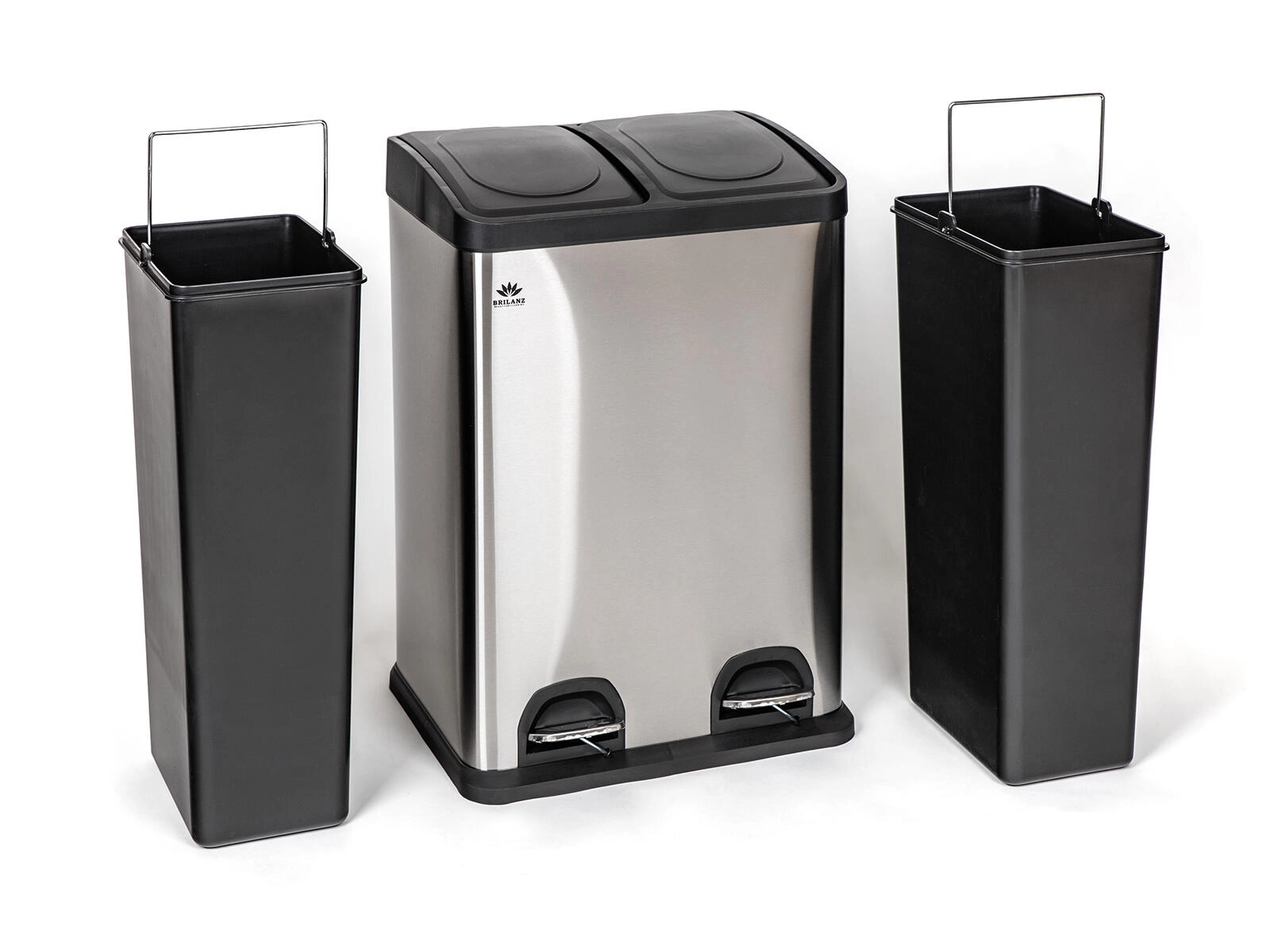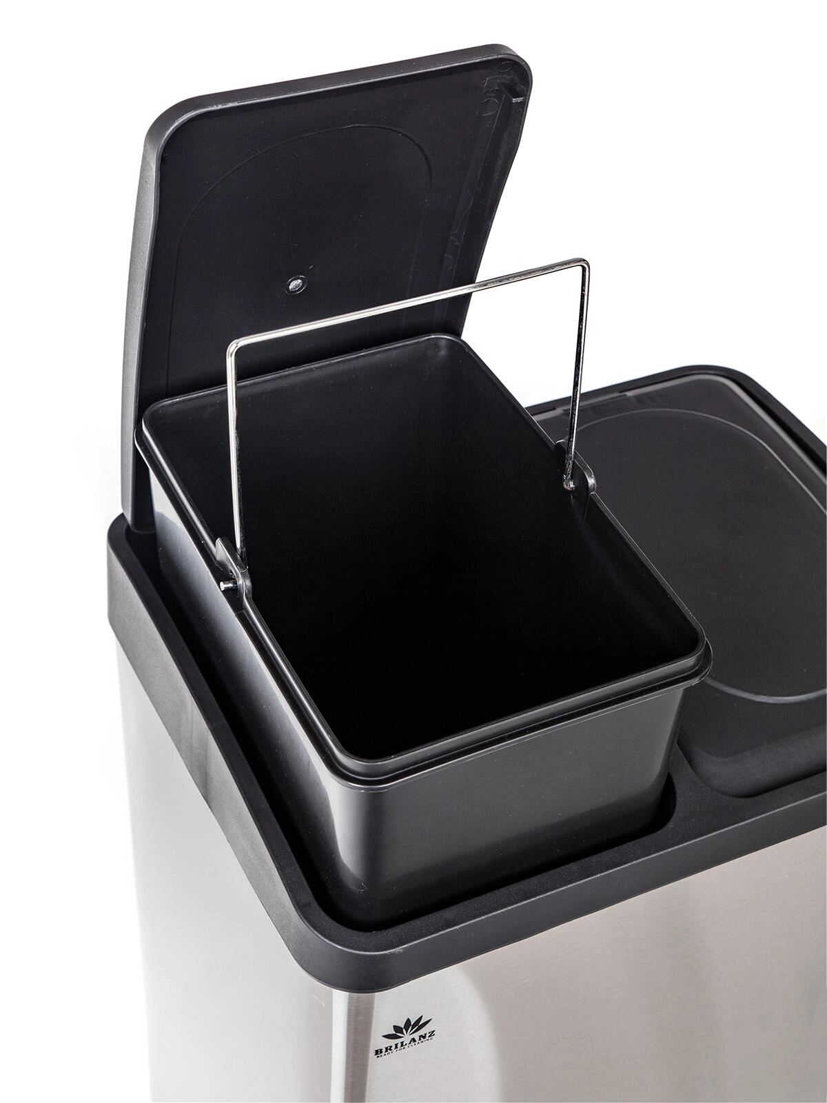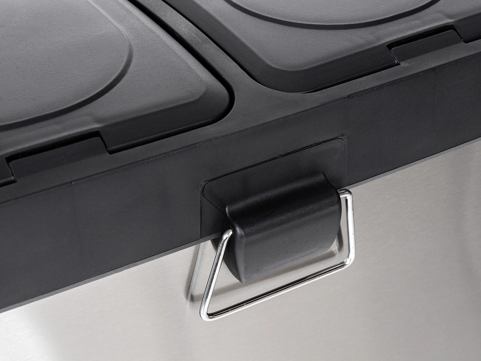 Praktikus és higiénikus, 40 l (2×20 l) űrtartalmú rozsdamentes acél szelektív hulladékgyűjtő, két pedállal az érintésmentes nyitáshoz. A két elkülönített rekesz lehetővé teszi a hulladék egyszerű szelektálását, a kivehető műanyag betétek megkönnyítik a tisztítást és a zsákcsere folyamatát, a záródó fedelek pedig segítenek csökkenteni a szagokat és a keresztkontaminációt.