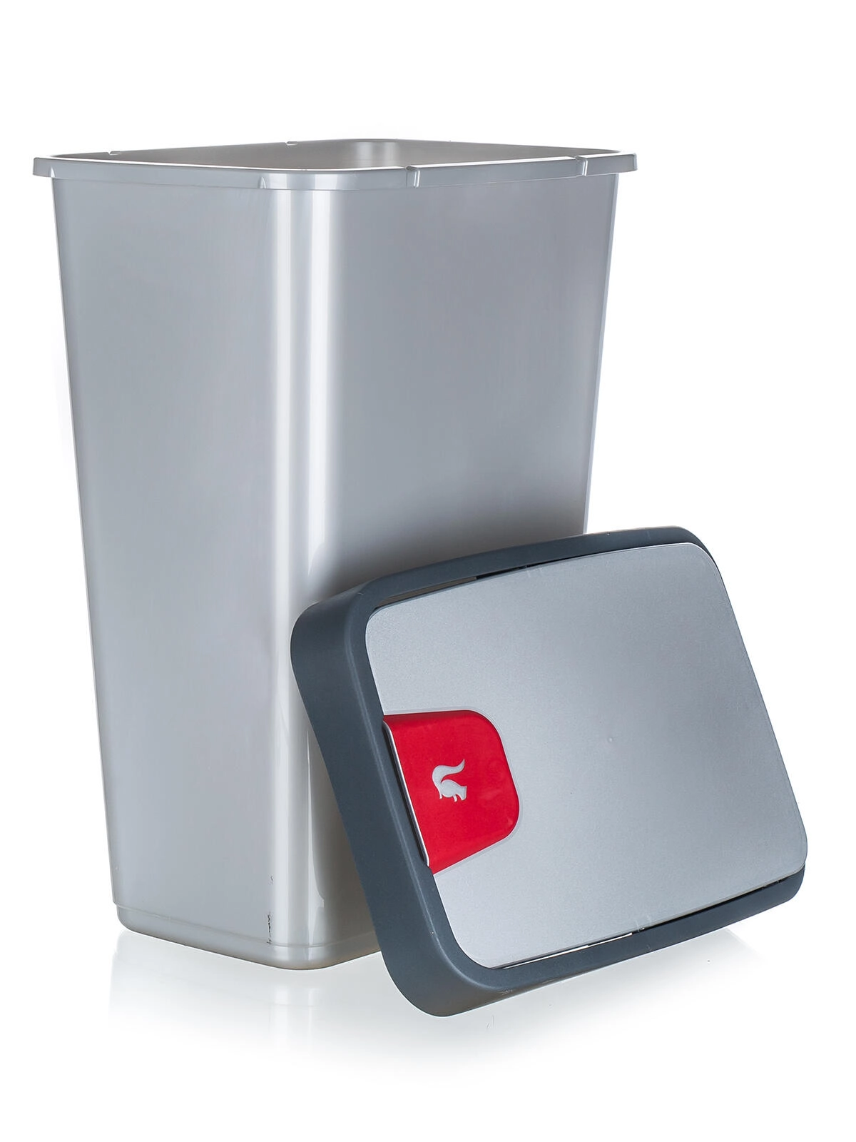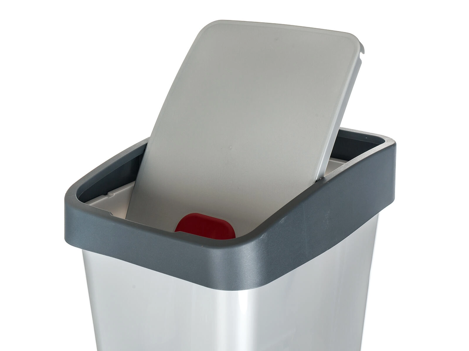 Praktikus, 45 literes, négyszögletes szemetes, amely helytakarékos és megkönnyíti a mindennapi takarítást. Kétfedeles üzemmóddal rendelkezik – nyitott vagy billenő – és könnyen kivehető kialakítással a kényelmes tisztításhoz. Strapabíró műanyag és elegáns ezüst/szürke kivitel konyhába, irodába és üzemekbe is illik.