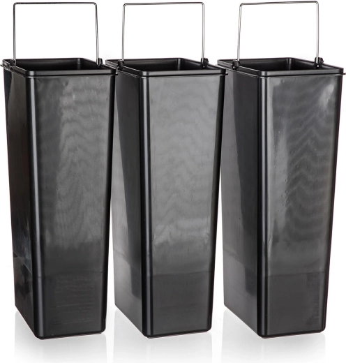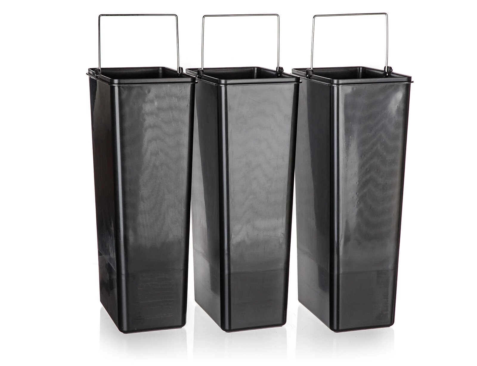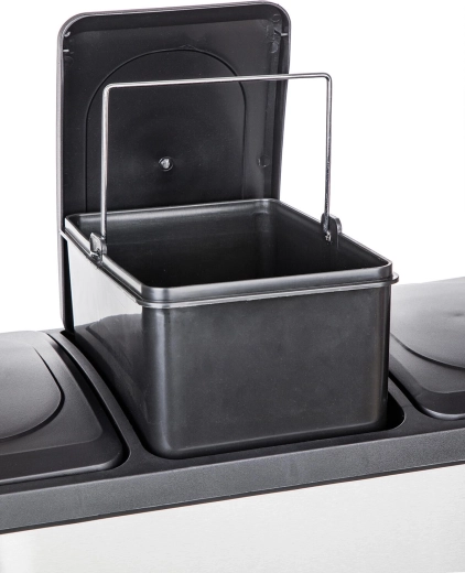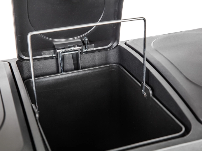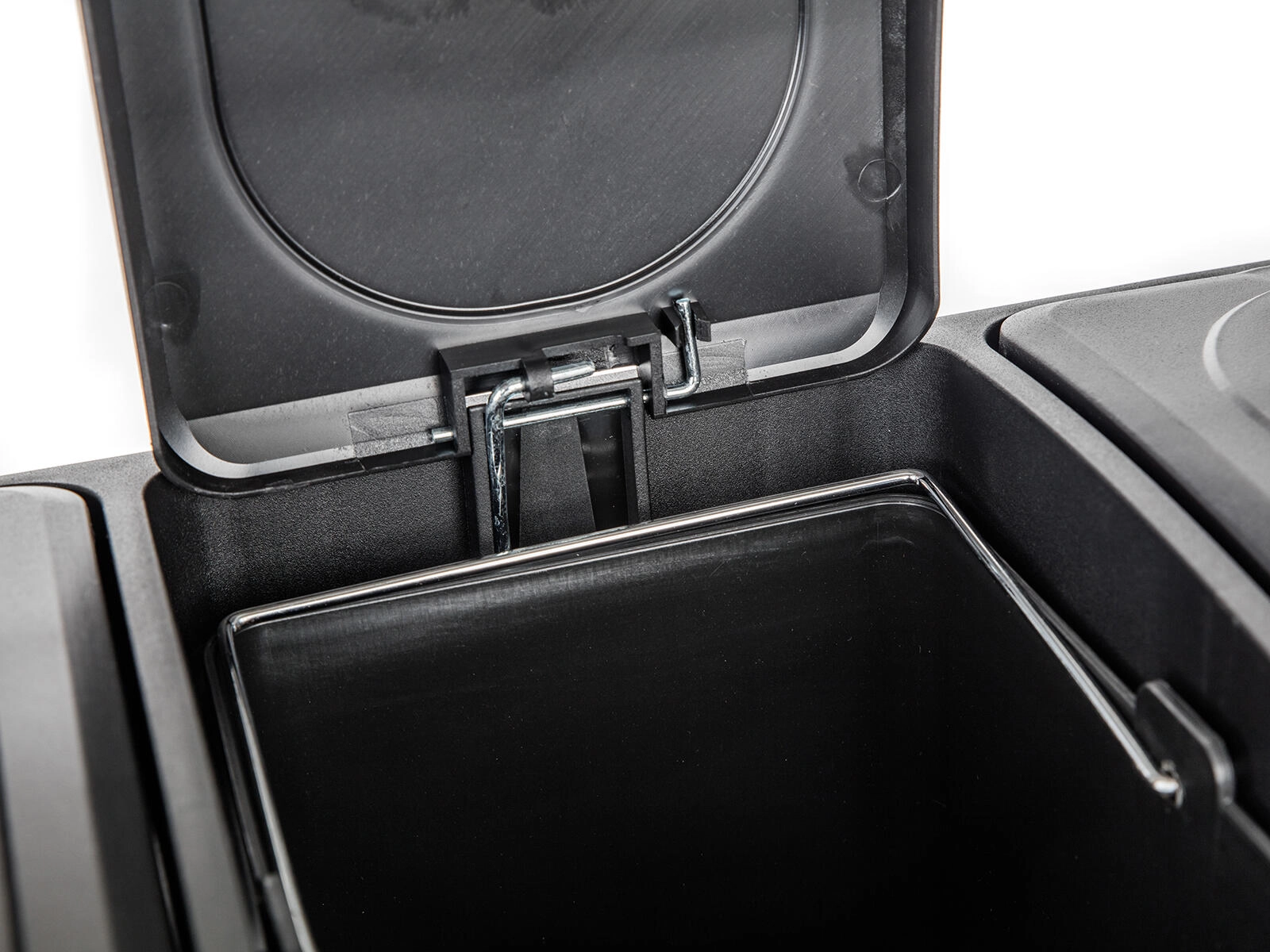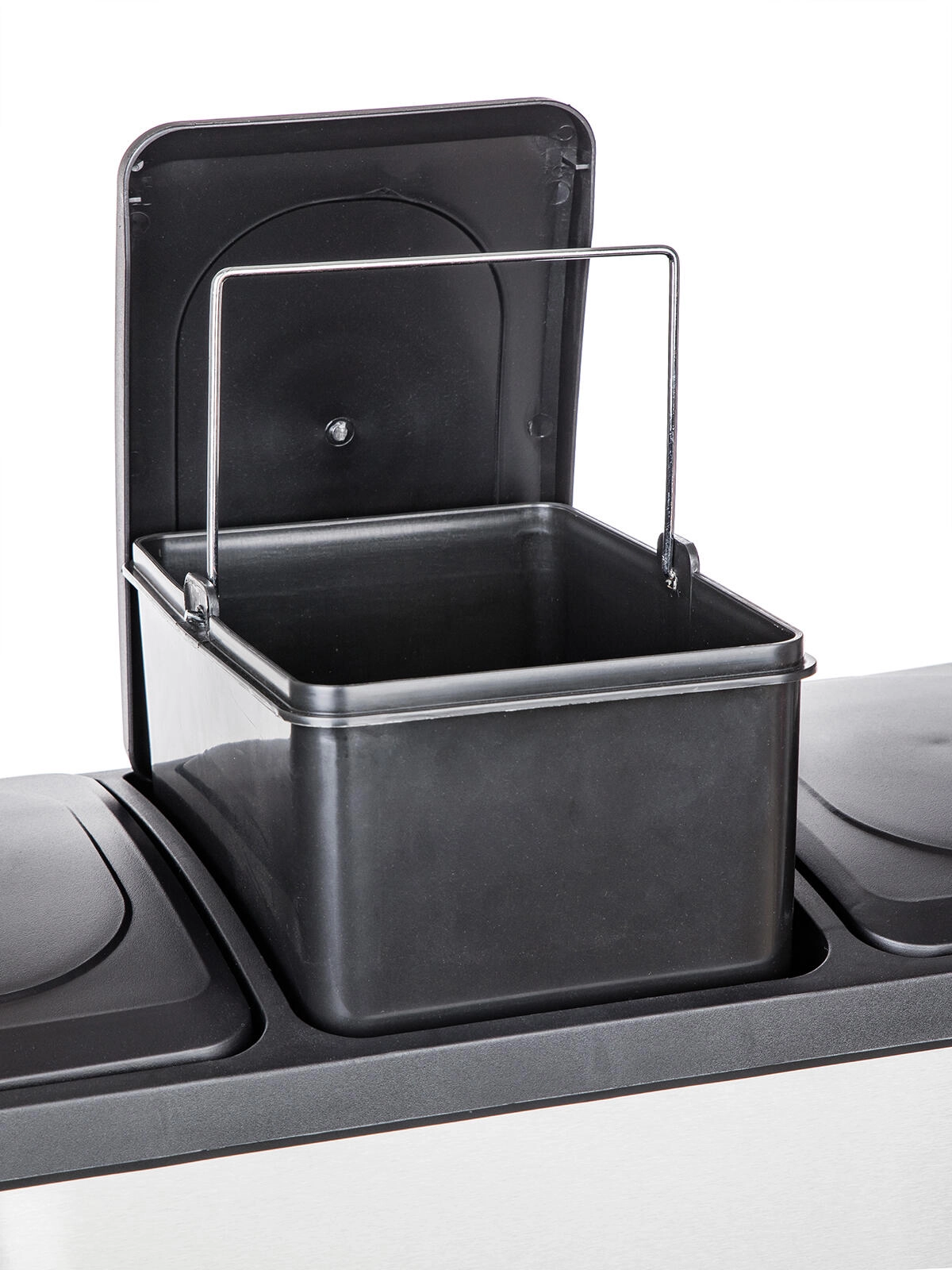 Minden rekesz saját, kivehető betéttel és fogantyúval rendelkezik, így a zsákcsere és a tisztítás gyors, rendetlenség nélkül. A karcsú, derékszögű test helytakarékos, és jól elfér fal mellett vagy a konyha sarkában.