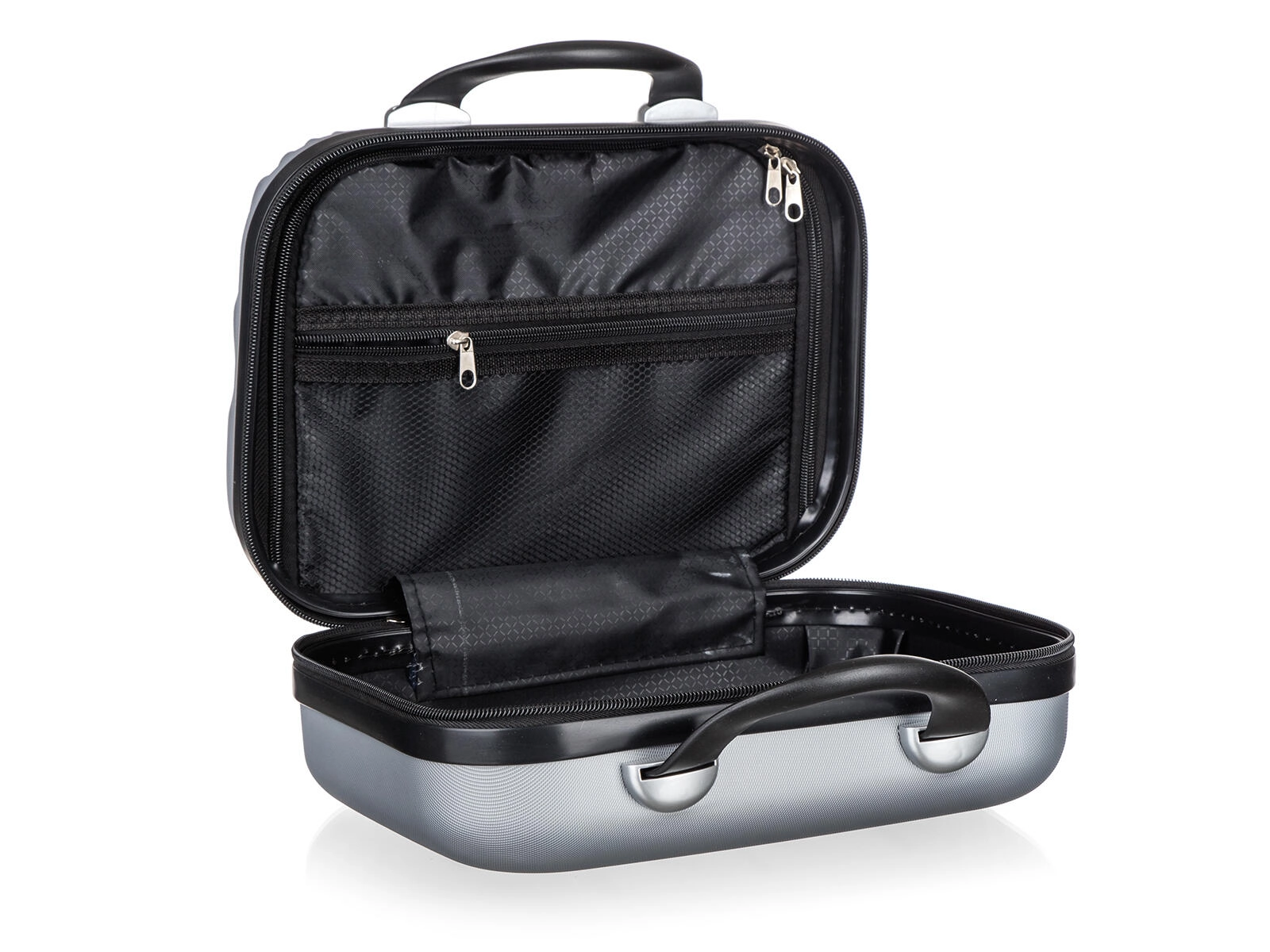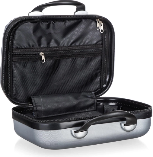 A belső tér textil cipzáras elválasztóval és hálós zsebbel kínál átlátható tárolást a kozmetikumoknak, elektronikának és apró kiegészítőknek. A dupla cipzárkocsik gyors nyitást és biztonságos zárást tesznek lehetővé, míg a robusztus fogantyúk kényelmes hordozást biztosítanak.