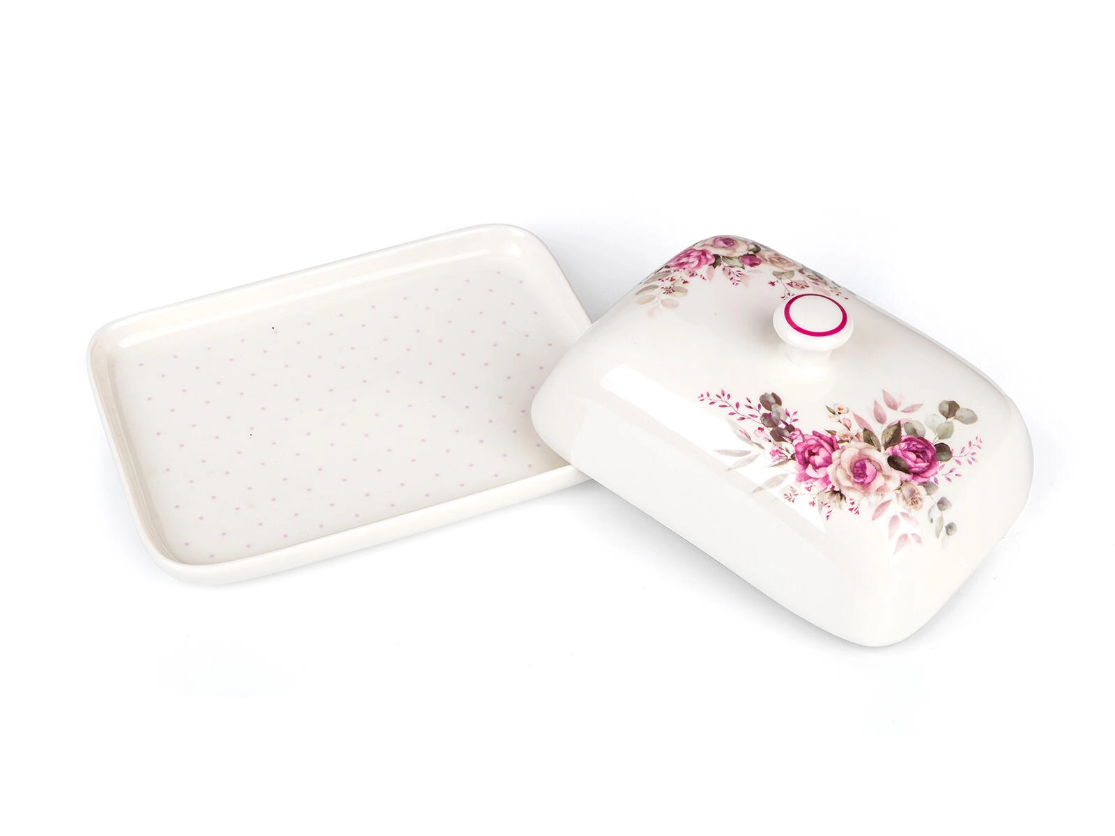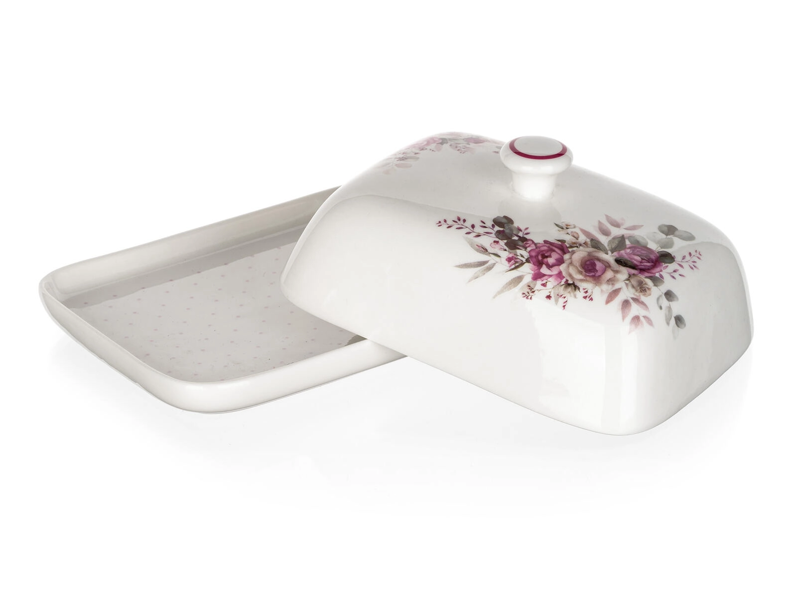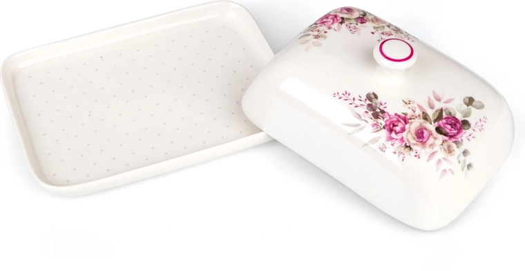 Elegáns ROSE kerámia vajtartó finom rózsaszín virágmintával, amely tovább frissen tartja a vajat, és szépen tálalja az asztalon. Praktikus fedél fogantyúval, fényes máz és ideális méret a hagyományos vajtömbhöz – stílusos és funkcionális kiegészítő a mindennapokra és az ünnepi terítéshez is.
