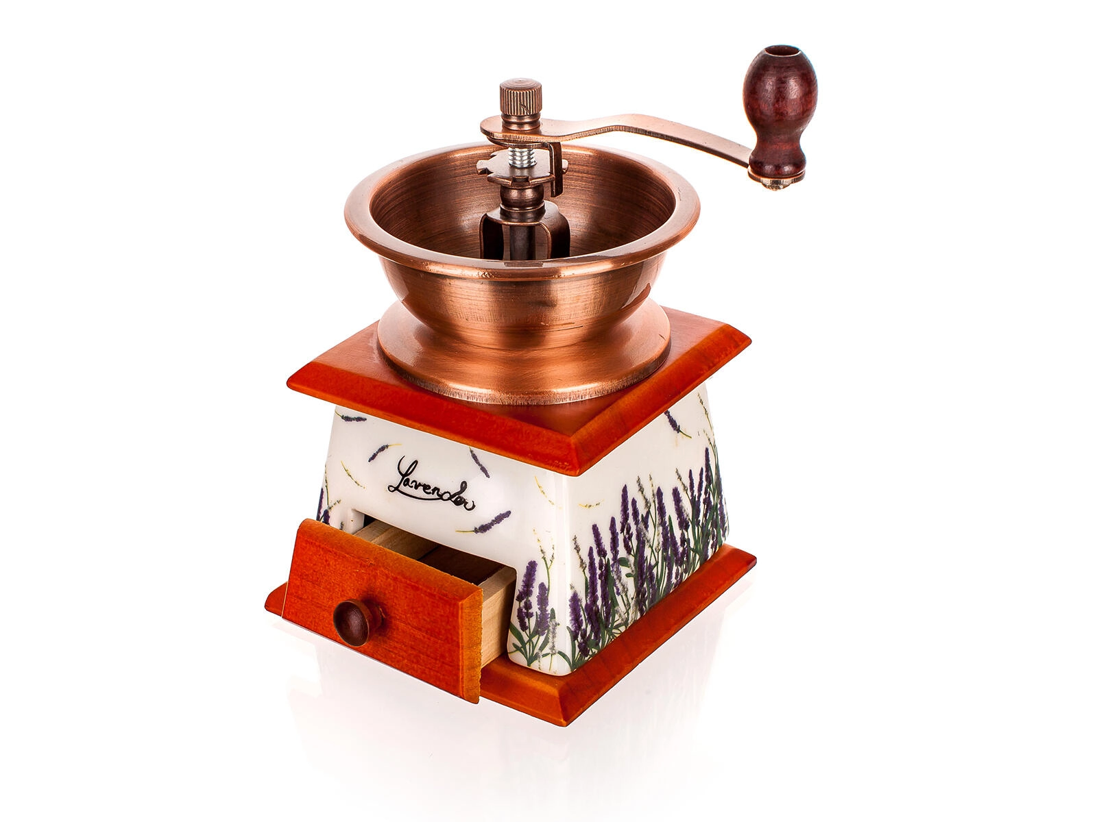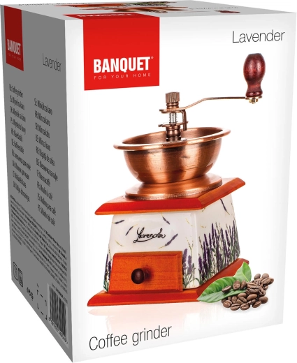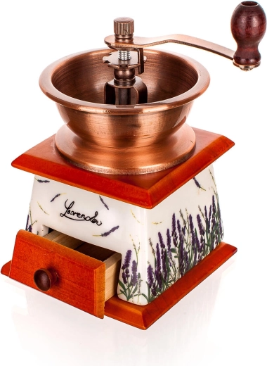 Ez az elegáns kézi kávédaráló a funkcionalitást és a designt ötvözi. A levendulamotívumos kerámia részlet karaktert ad a konyhának, a fiókos fa alap megkönnyíti az őrlemény gyűjtését, a fém garat és a kar pedig egyenletes őrlést biztosít. A állítható kerámia mechanizmusnak köszönhetően könnyedén beállíthatja az őrlés finomságát eszpresszóhoz, filterkávéhoz vagy french presshez.