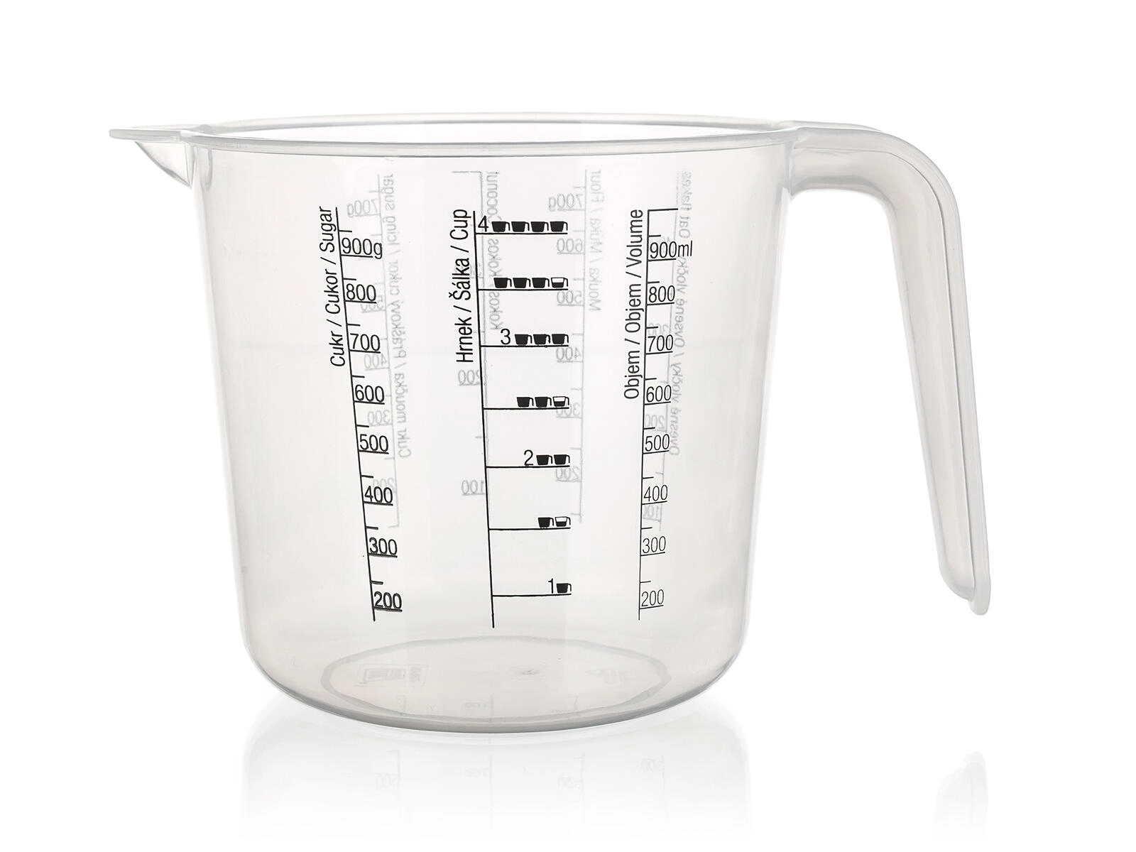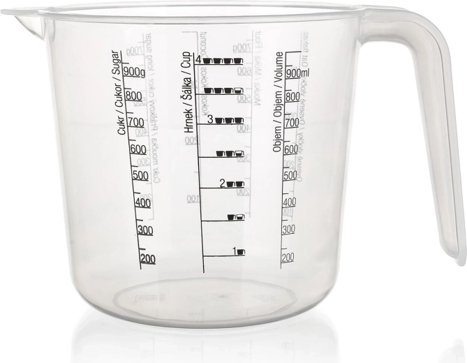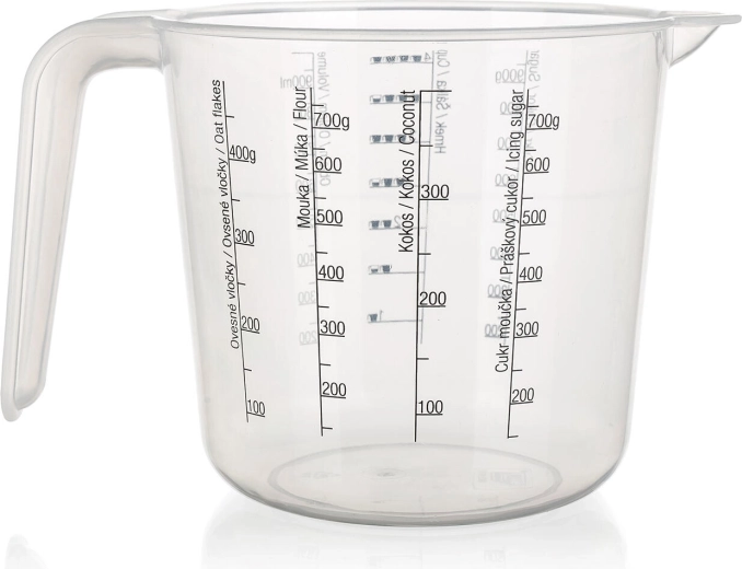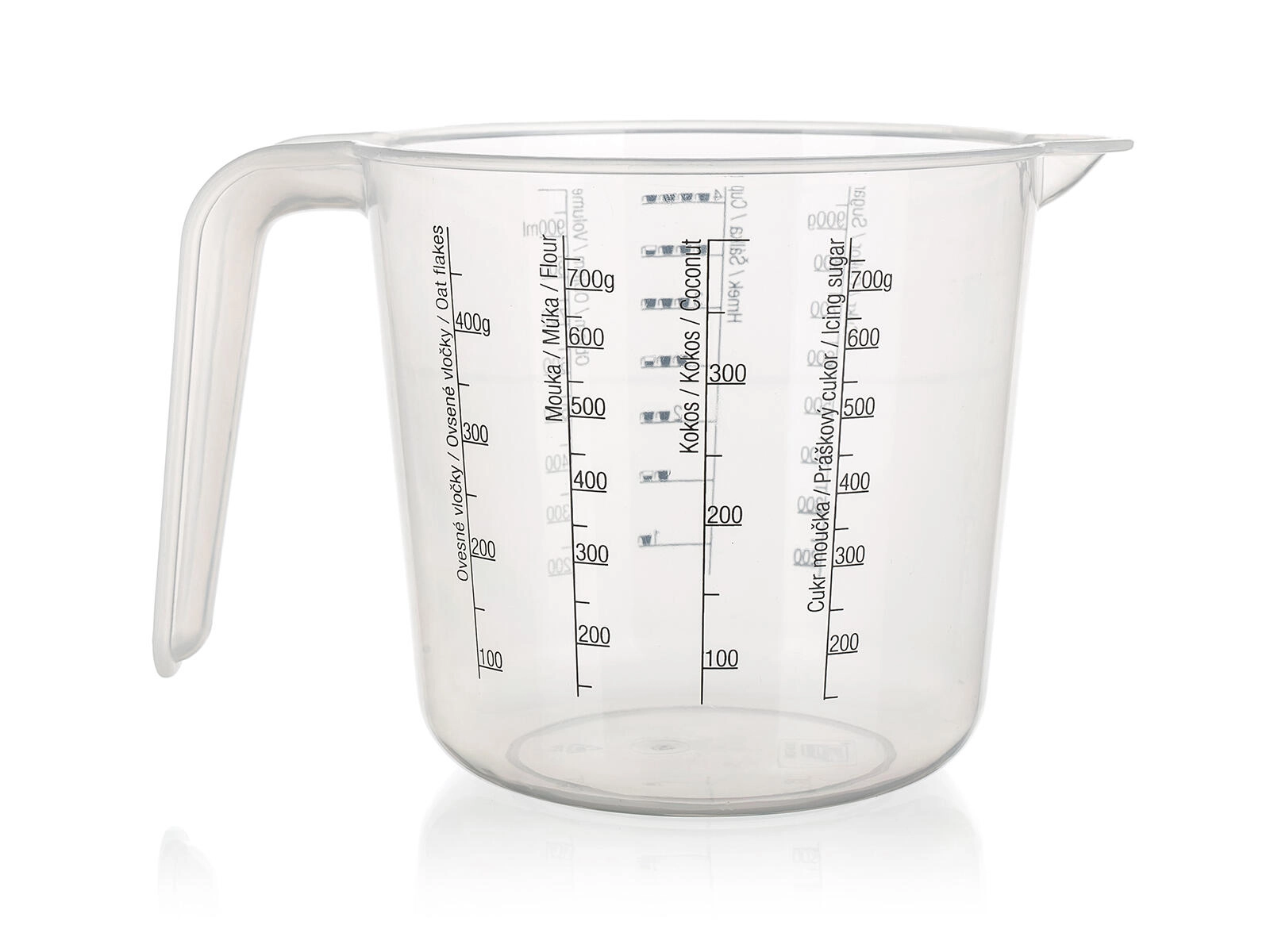 Praktikus, 1 literes műanyag mérőkancsó, amely megkönnyíti a pontos főzést és sütést a áttekinthető skáláknak köszönhetően, szilárd és folyékony alapanyagokhoz egyaránt. Mérőskálát kínál kókuszhoz, zabpehelyhez, liszthez, porcukorhoz, kristálycukorhoz, valamint térfogatot ml-ben és csészékben, így minden egy edényben kéznél van.
