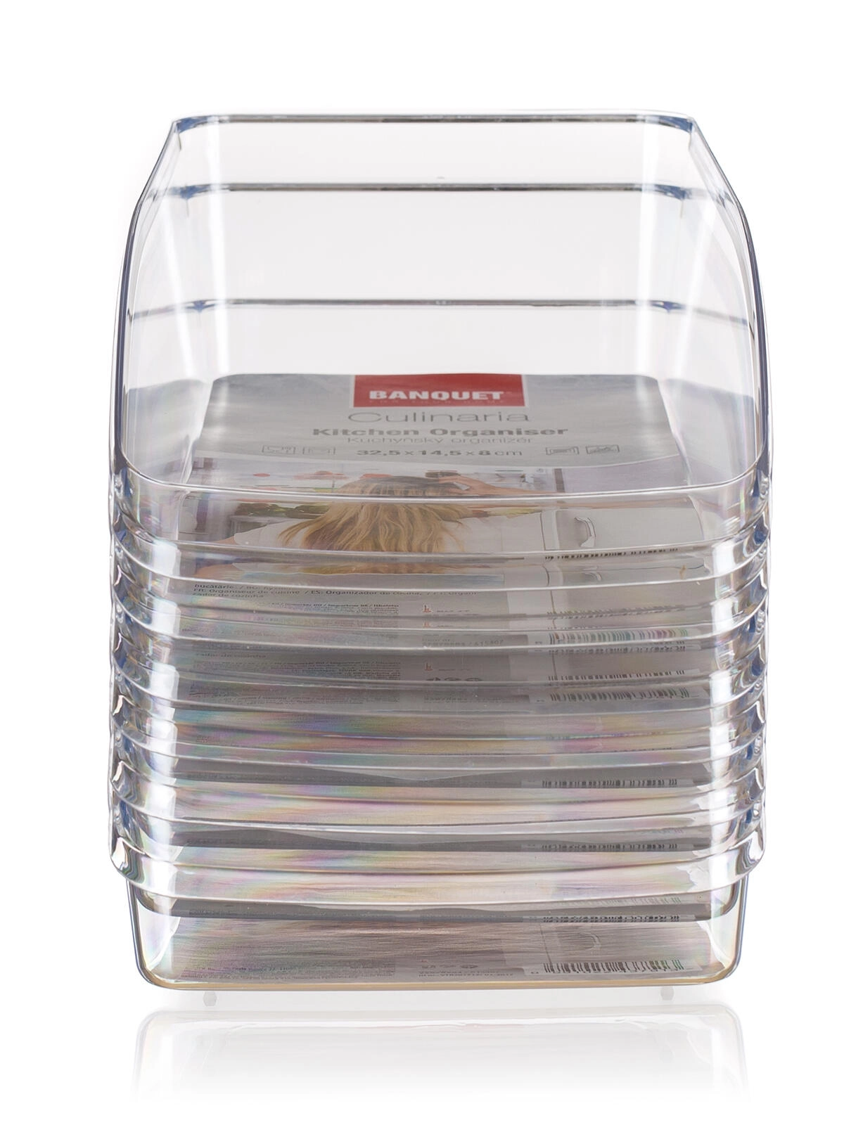 Ez az univerzális hűtőszervező hatékonyan segít szétválogatni az élelmiszereket, italokat és apró hozzávalókat. A átlátszó falaknak köszönhetően mindig látja, mi van belül, és könnyebben tarthatja a hűtőt tisztán és rendezett állapotban. Az egyenes oldalak támogatják a helytakarékos egymásra rakást egymás mellett és egymás felett.
